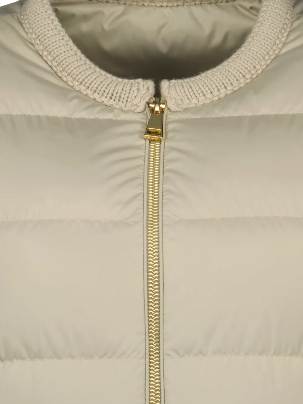 Бежевый стеганый дизайн, трикотажный воротник, застежка-молния, длинные рукава, нашивка с логотипом