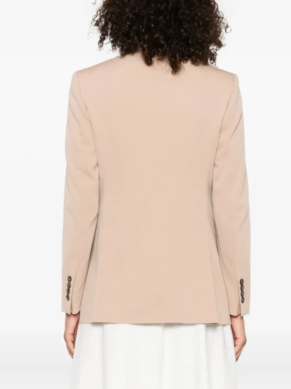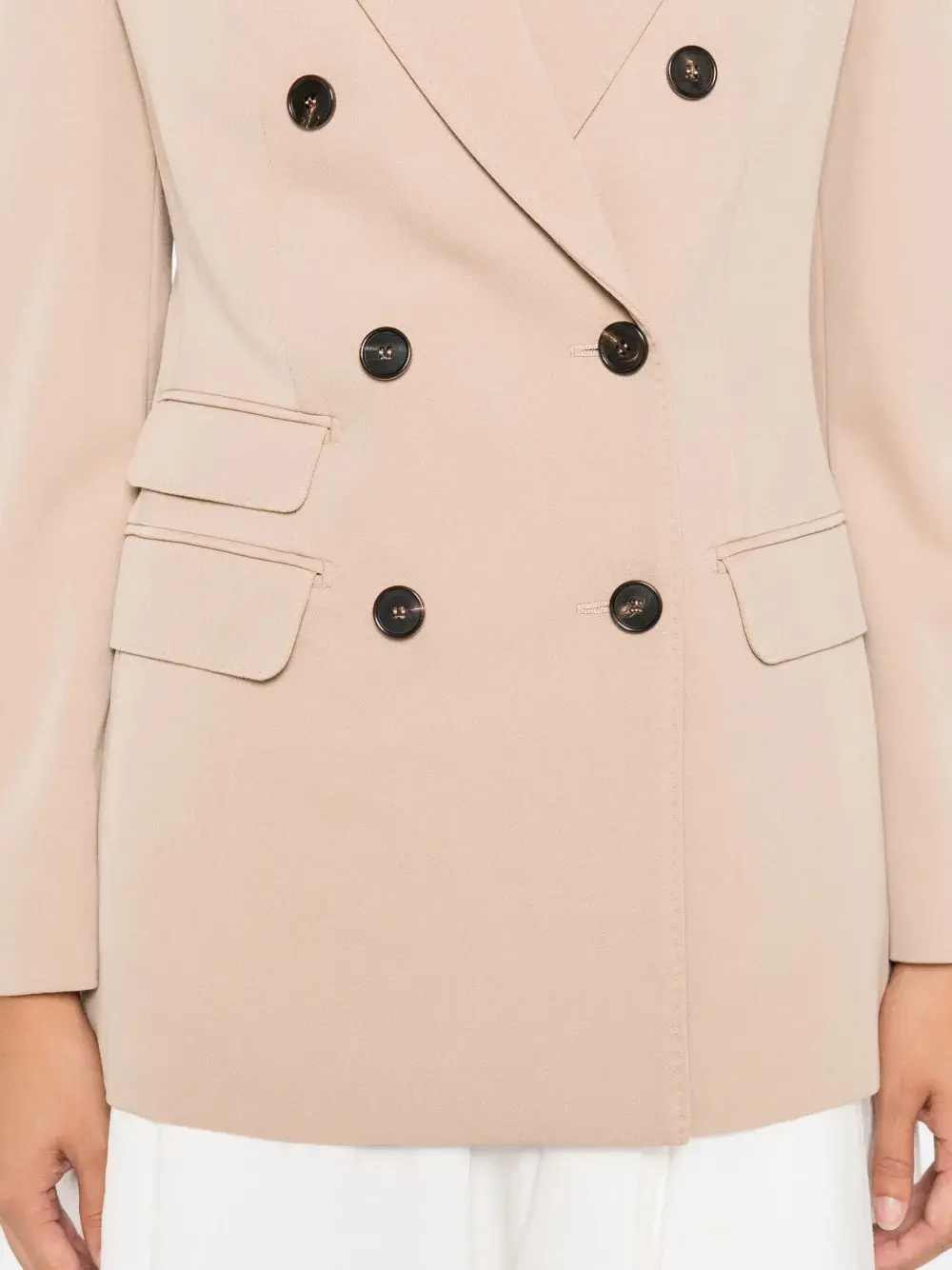Бежевый двубортный пиджак с застежкой на пуговицы, боковыми карманами, длинными рукавами