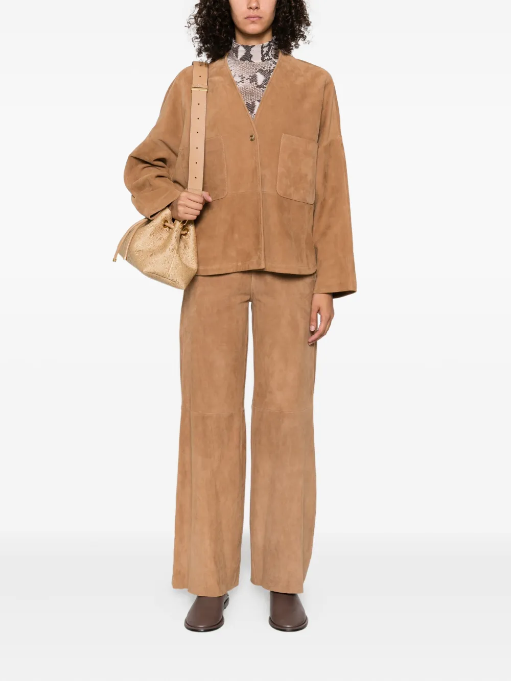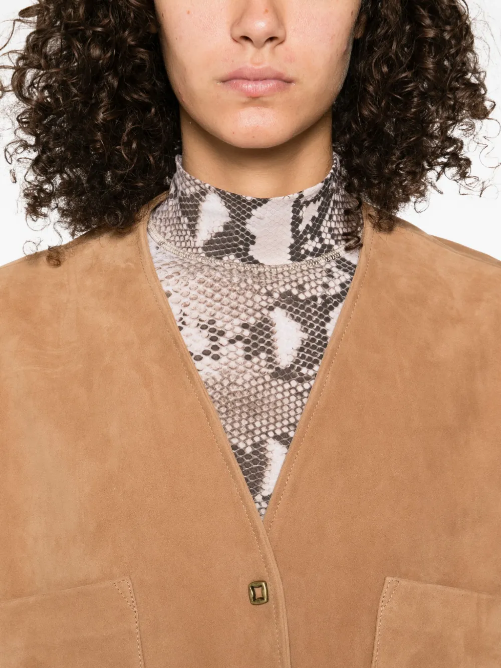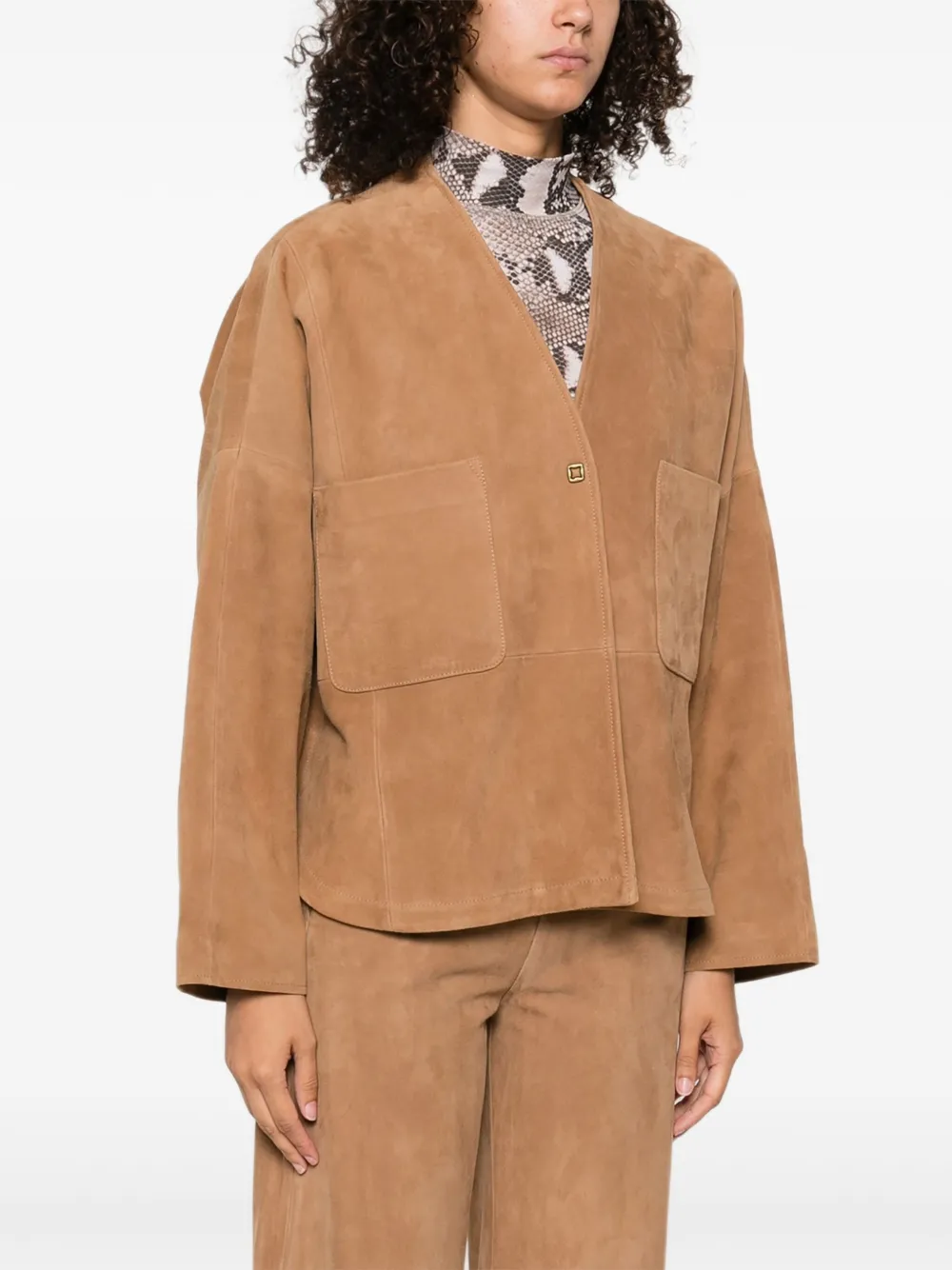 Коричневая замша, накладные карманы, застежка на пуговицы, V-образный вырез, длинные рукава