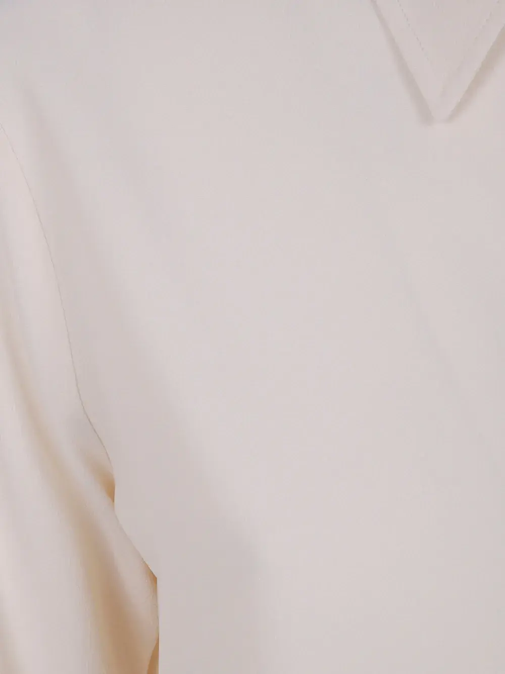 Белый воротник-поло, длинные рукава, застежка на пуговицы, закругленный подол