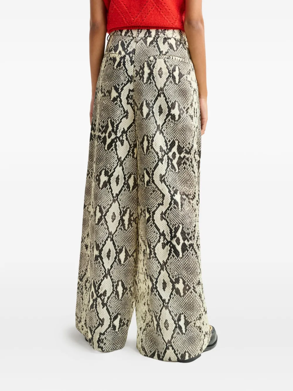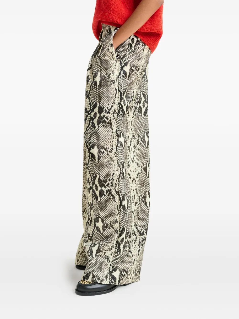 Бежевый змеиный принт, складки на талии, прорезные карманы, косые карманы