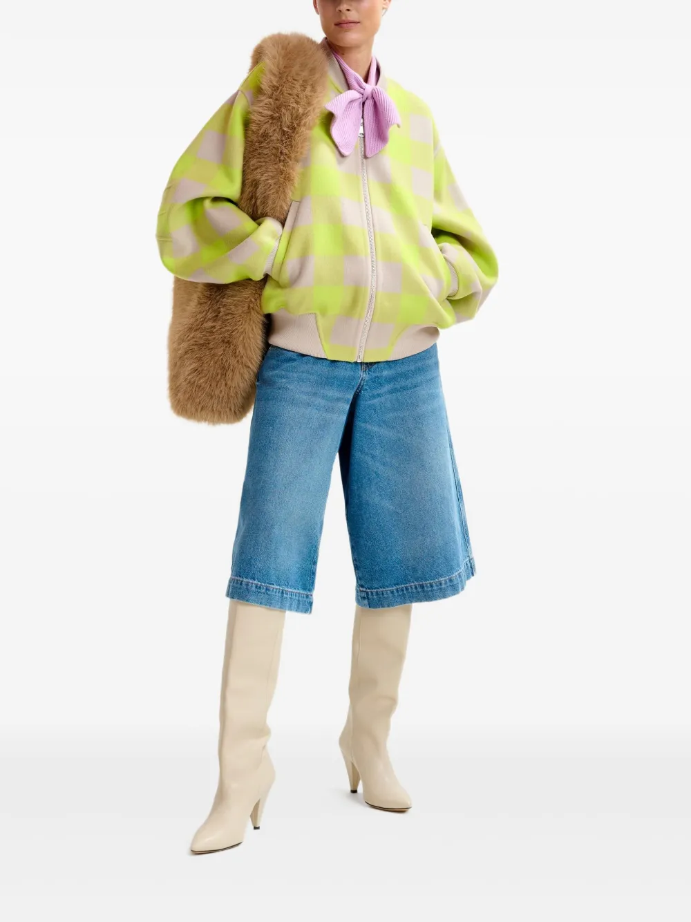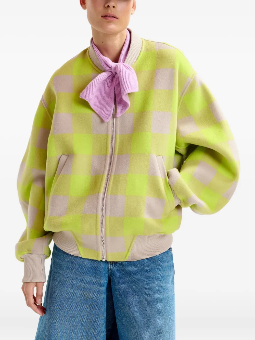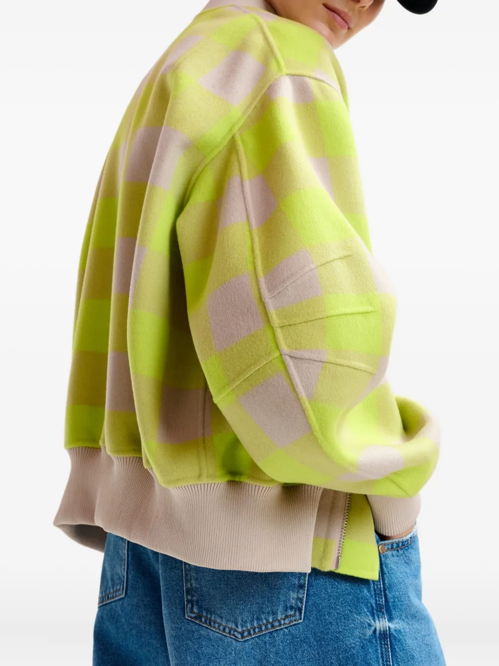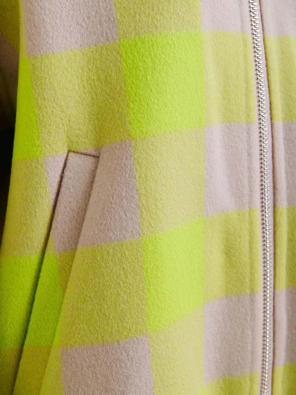Бежево-желтый клетчатый узор, застежка-молния по всей длине, спущенные плечи, косые боковые карманы, шерсть
