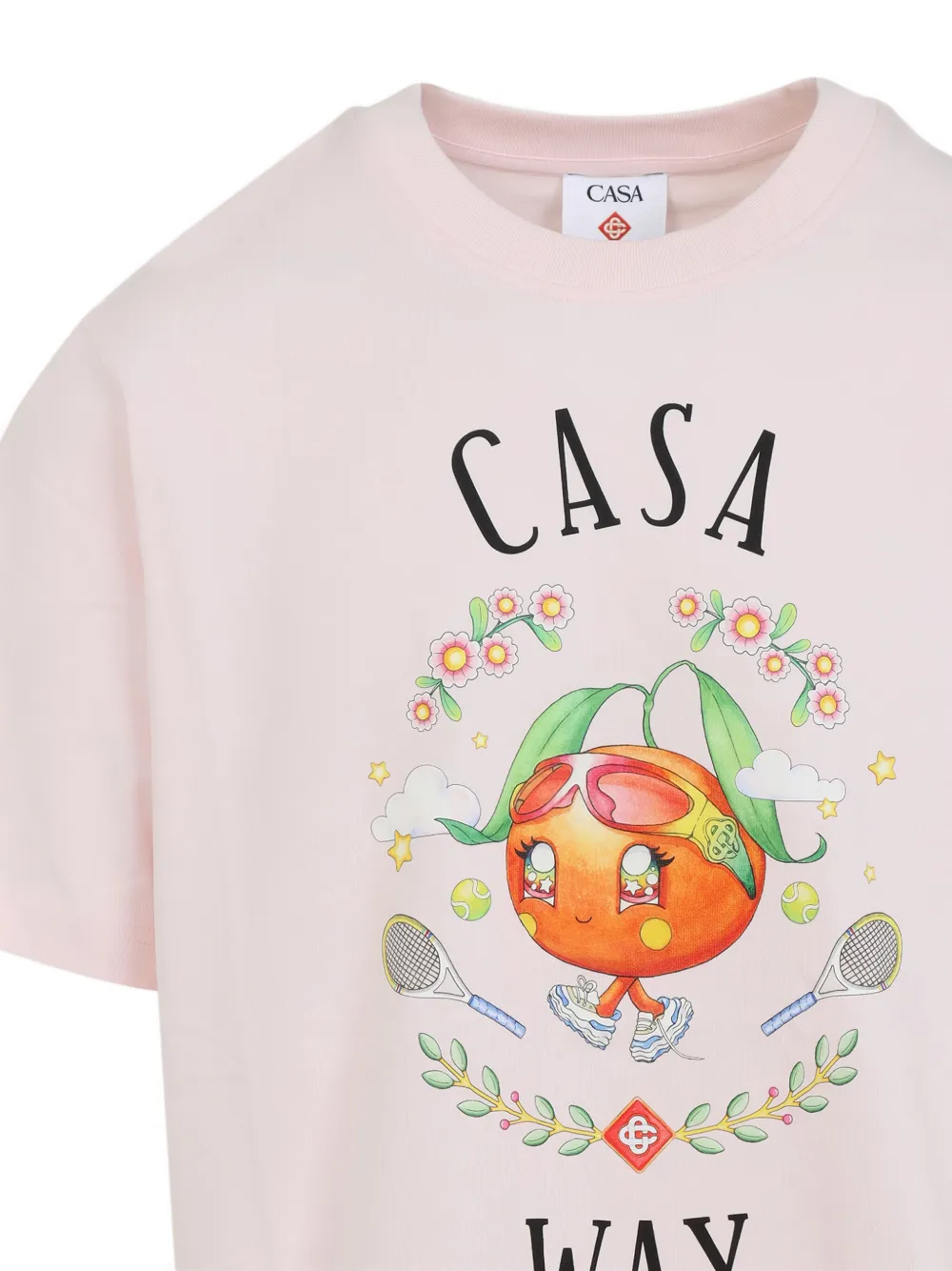 Светло-розовый оранжевый - графика талисмана, надпись "casa", надпись "way", теннисные ракетки, графика, цветочная графика