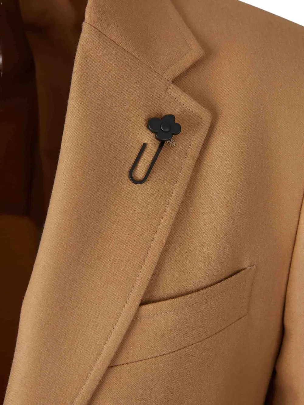 Пуговицы цвета верблюжьего золота, карманы с клапанами, однобортный пиджак, брошь с логотипом