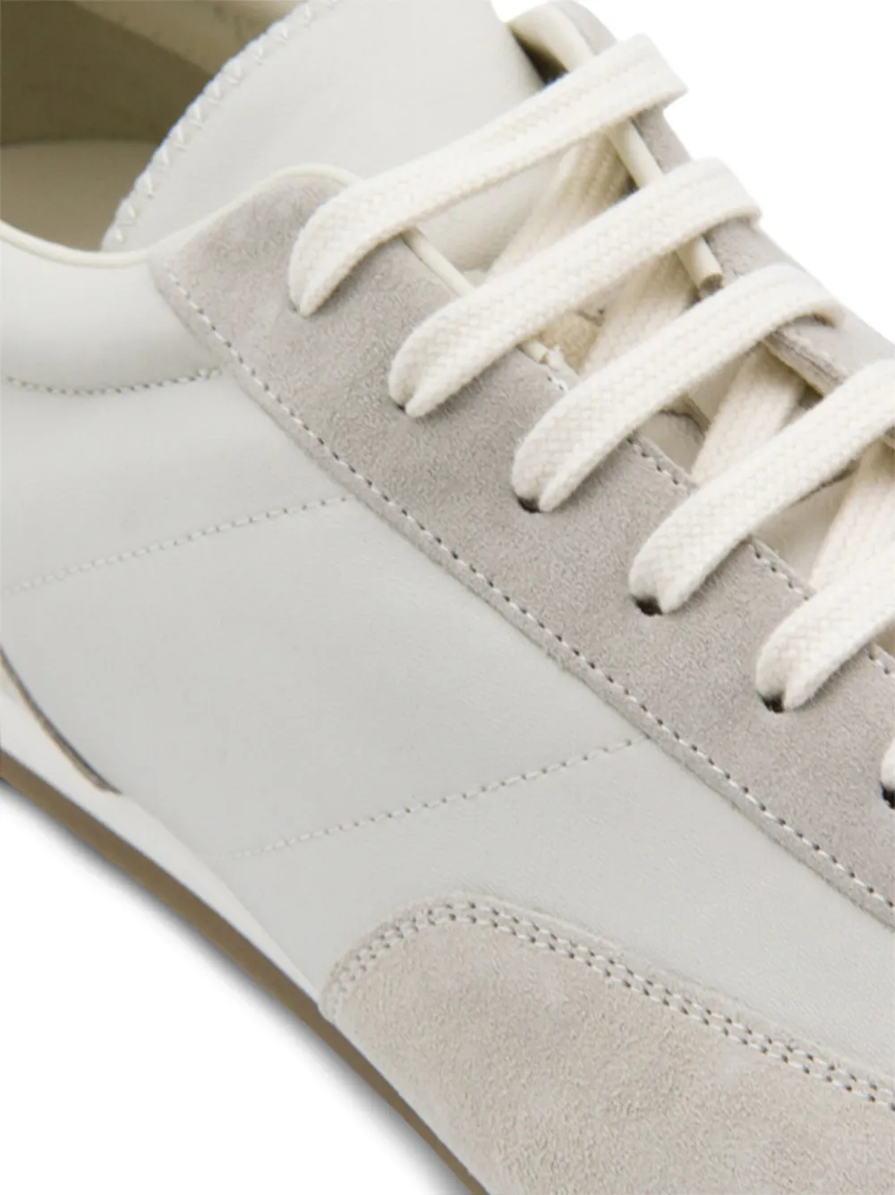 Верх из кожи бежевого цвета, замшевая вставка на пятке, шнуровка, плоская подошва, тональная строчка