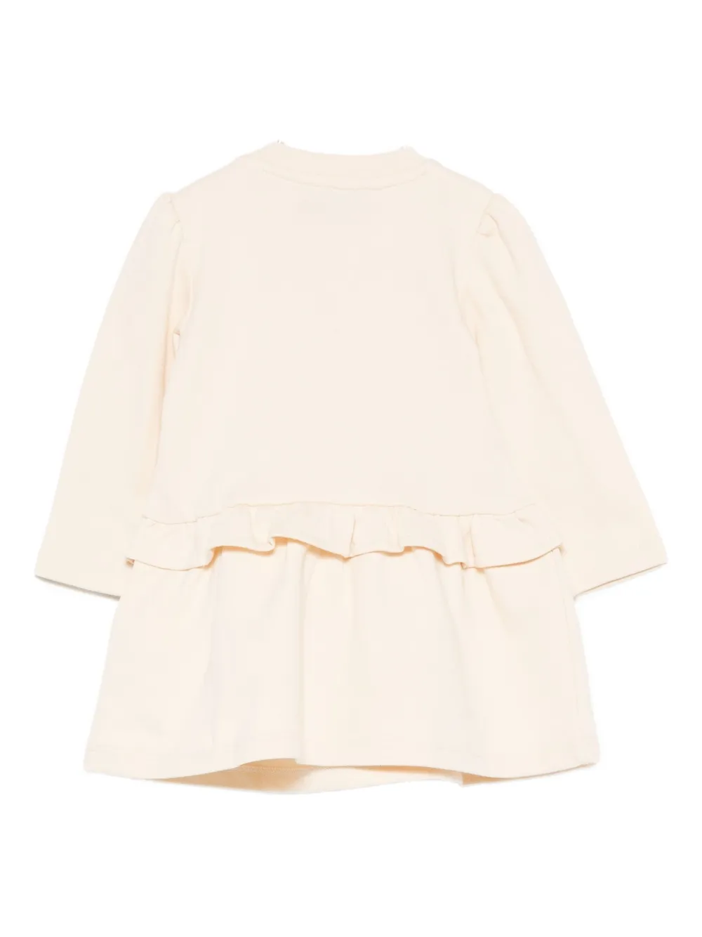 Бежевый вышитый плюшевый мишка, оборка по подолу, длинные рукава, круглый вырез, хлопковый материал