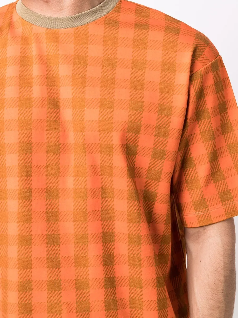 Принт в клетку, круглый вырез, приспущенные плечи, короткие рукава и прямой подол. Цвет: оранжевый. Это унисекс-модель. Обратите внимание, что для нее используется мужская размерная сетка. Узнать больше о том, какие товары получают отметку «Ответственный выбор», можно из материала «Как мы оцениваем экологичность и этичность».