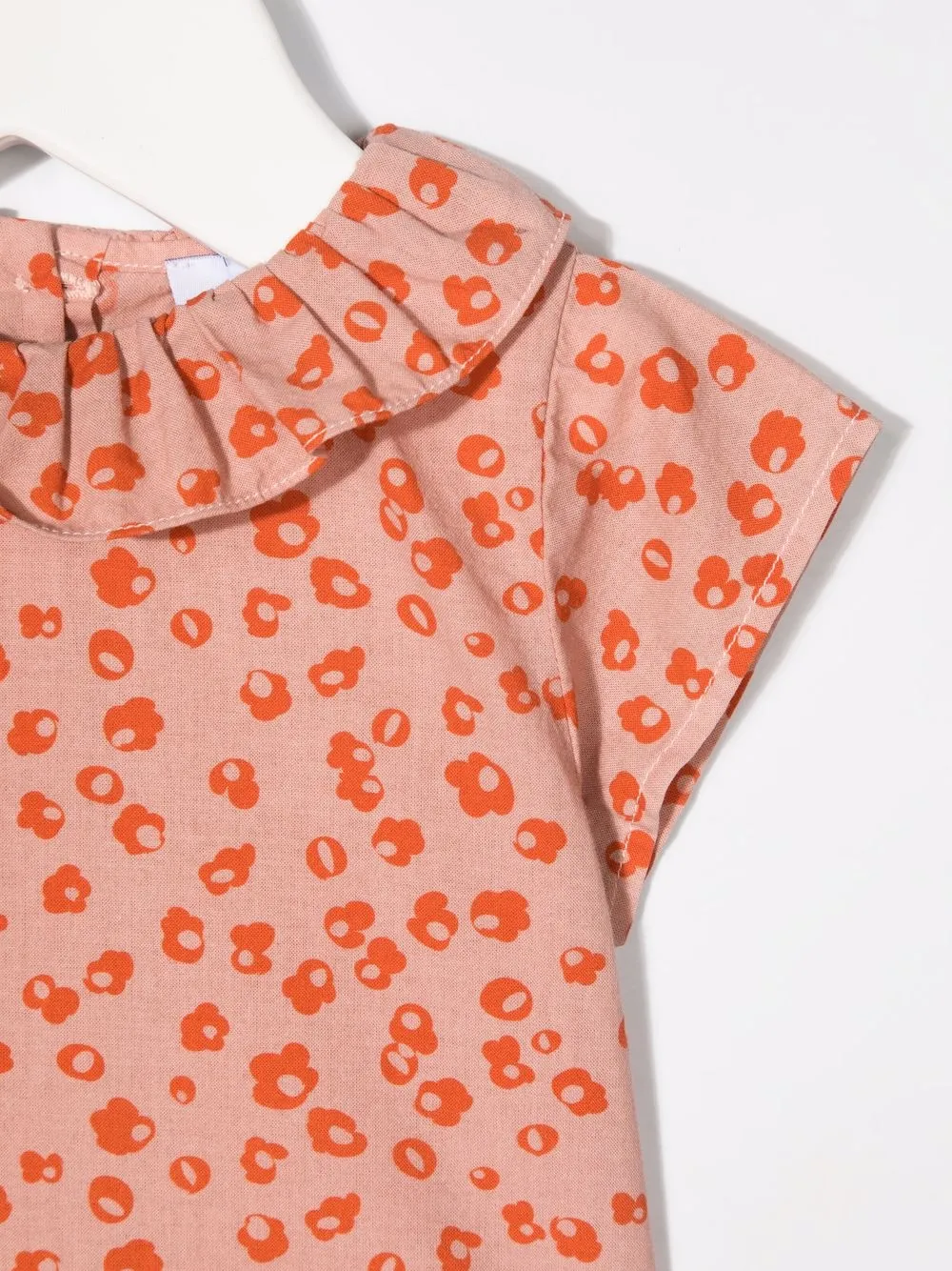 Абстрактный принт, вставки с оборками, застежка на пуговицы сзади, короткие рукава и прямой подол.