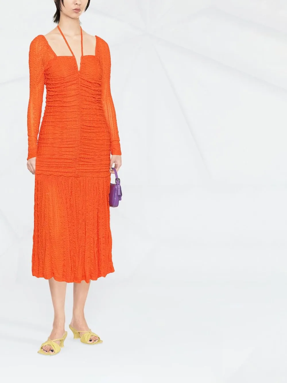 Оранжевый, присборенный лиф, кружевная вышивка, завязки вокруг шеи, полупрозрачный дизайн, расклешенная юбка, длинные рукава и длина миди. POSITIVELY CONSCIOUS: У каждого товара из коллекции этого бренда есть сертификат Carbon Neutral. Он подтверждает, что производитель контролирует выбросы парниковых газов и компенсирует углеродный след..