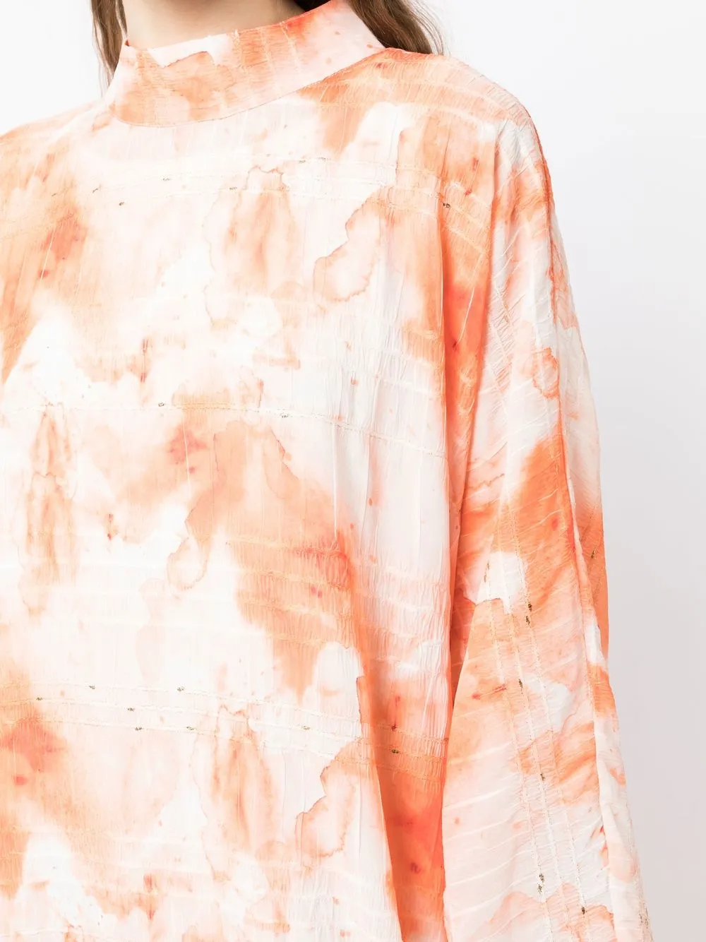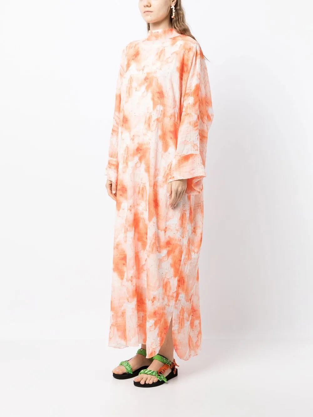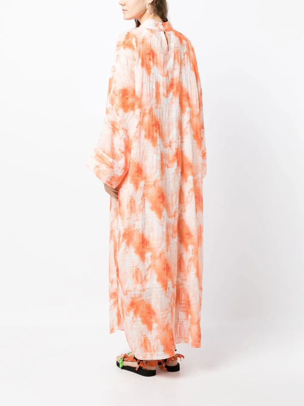Светло-оранжевый, белый, расклешенный крой, длинные широкие рукава, силуэт «кафтан» и принт тай-дай.
