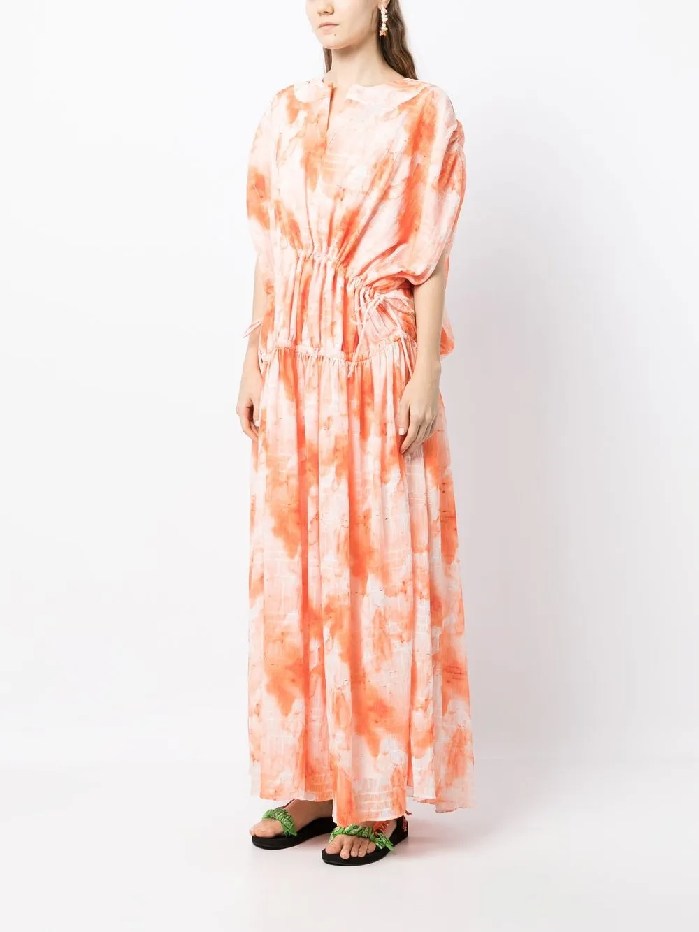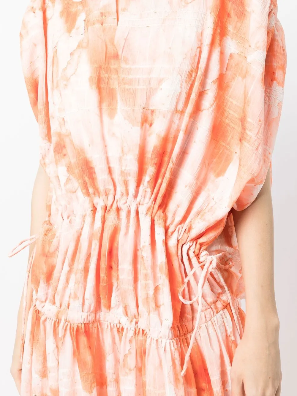 Светло-оранжевый, белый, расклешенный крой, рукава по локоть, широкие рукава, принт тай-дай и силуэт «кафтан».
