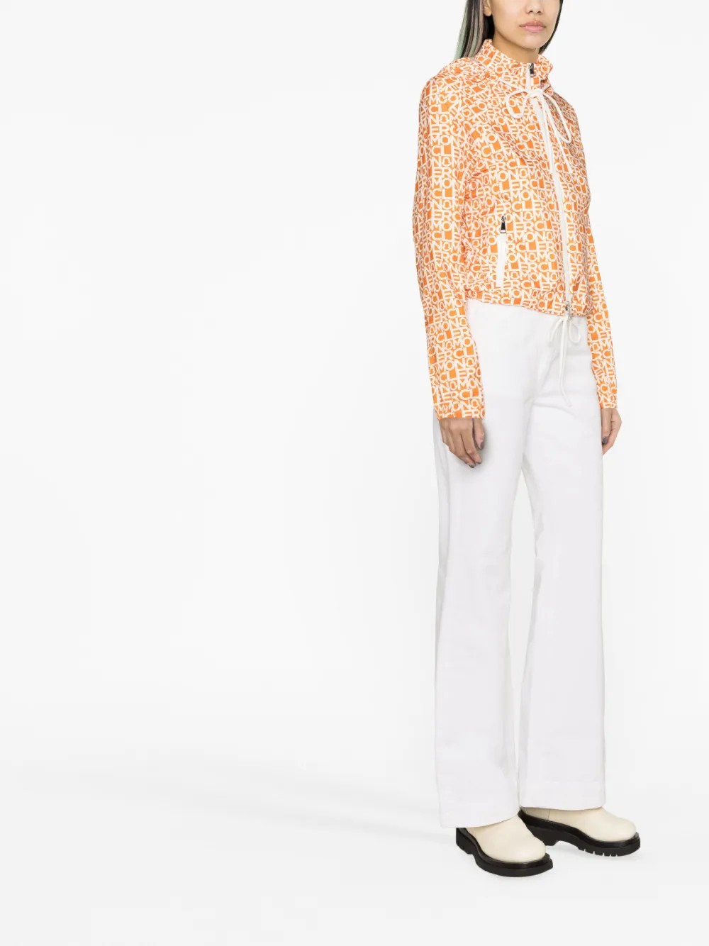 Сплошной принт с логотипом, высокий воротник, потайной капюшон, двусторонняя молния спереди, длинные рукава реглан, эластичные манжеты, два кармана на молнии по бокам и подол с кулиской.