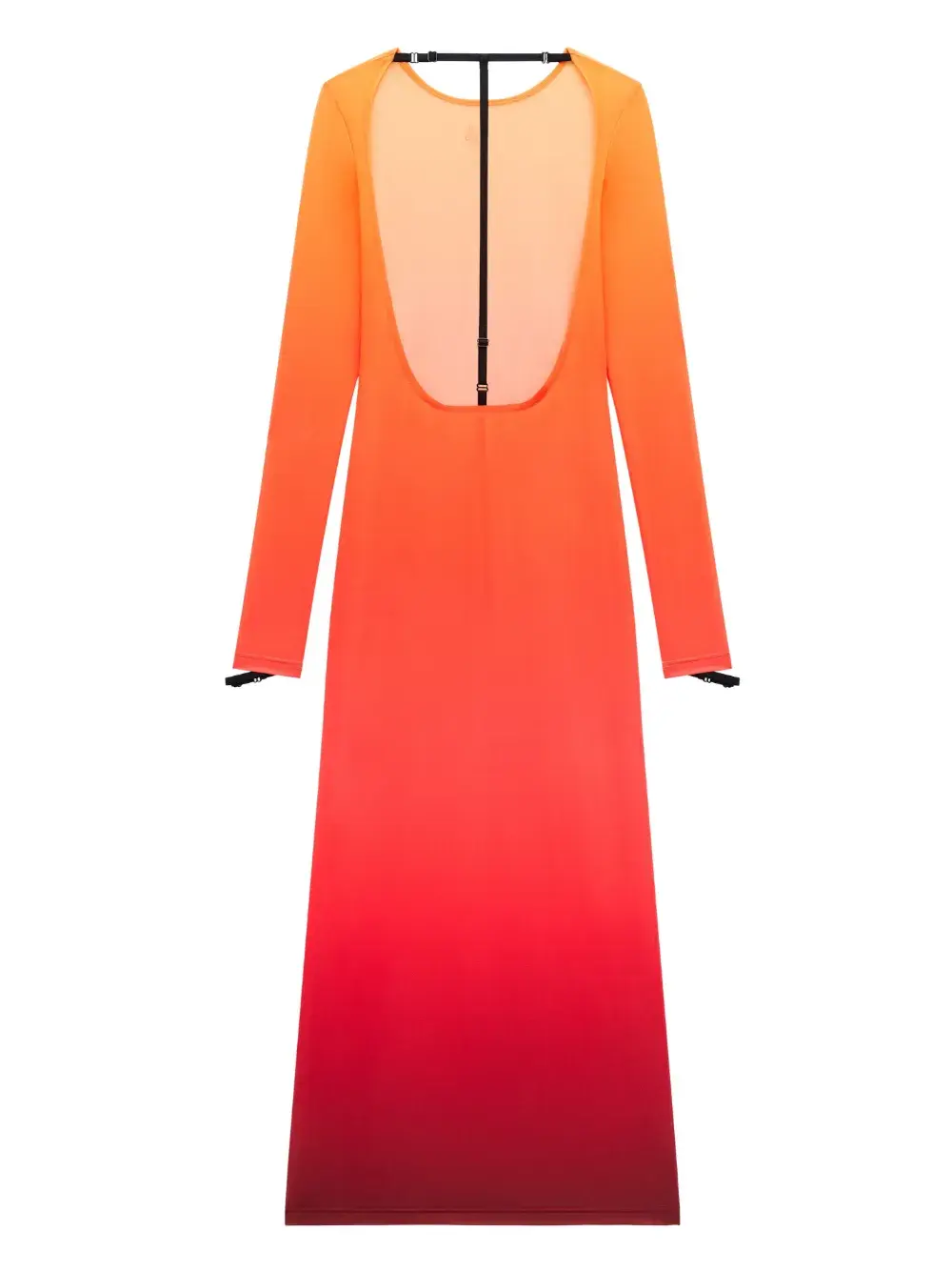 Оранжевый, красный, бордовый, градиентный эффект, полупрозрачный дизайн, длинные рукава, открытая спина, модель без застежки, регулируемый ремешок сзади и длинная модель.