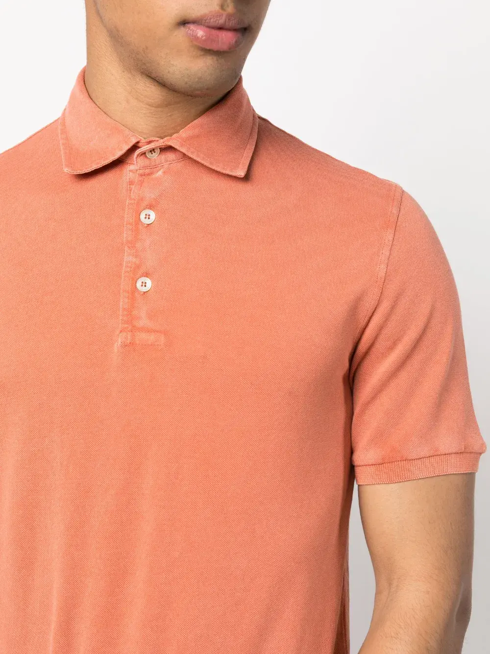 Персиково-оранжевый, хлопок, ткань джерси, воротник поло, короткая застежка на пуговицах спереди, короткие рукава и прямой подол.