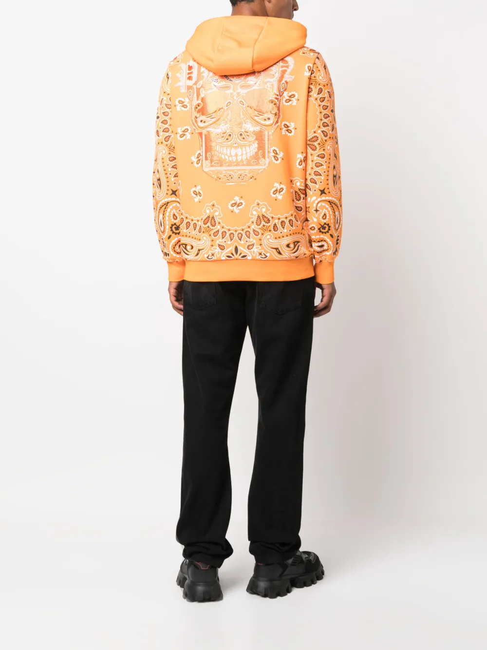 Мандариново-оранжевый, черный/белый, узор пейсли, принт с изображением черепа на тыльной стороне, нашивка с логотипом спереди, объемный капюшон, застежка на молнии спереди, длинные рукава и прямой подол.