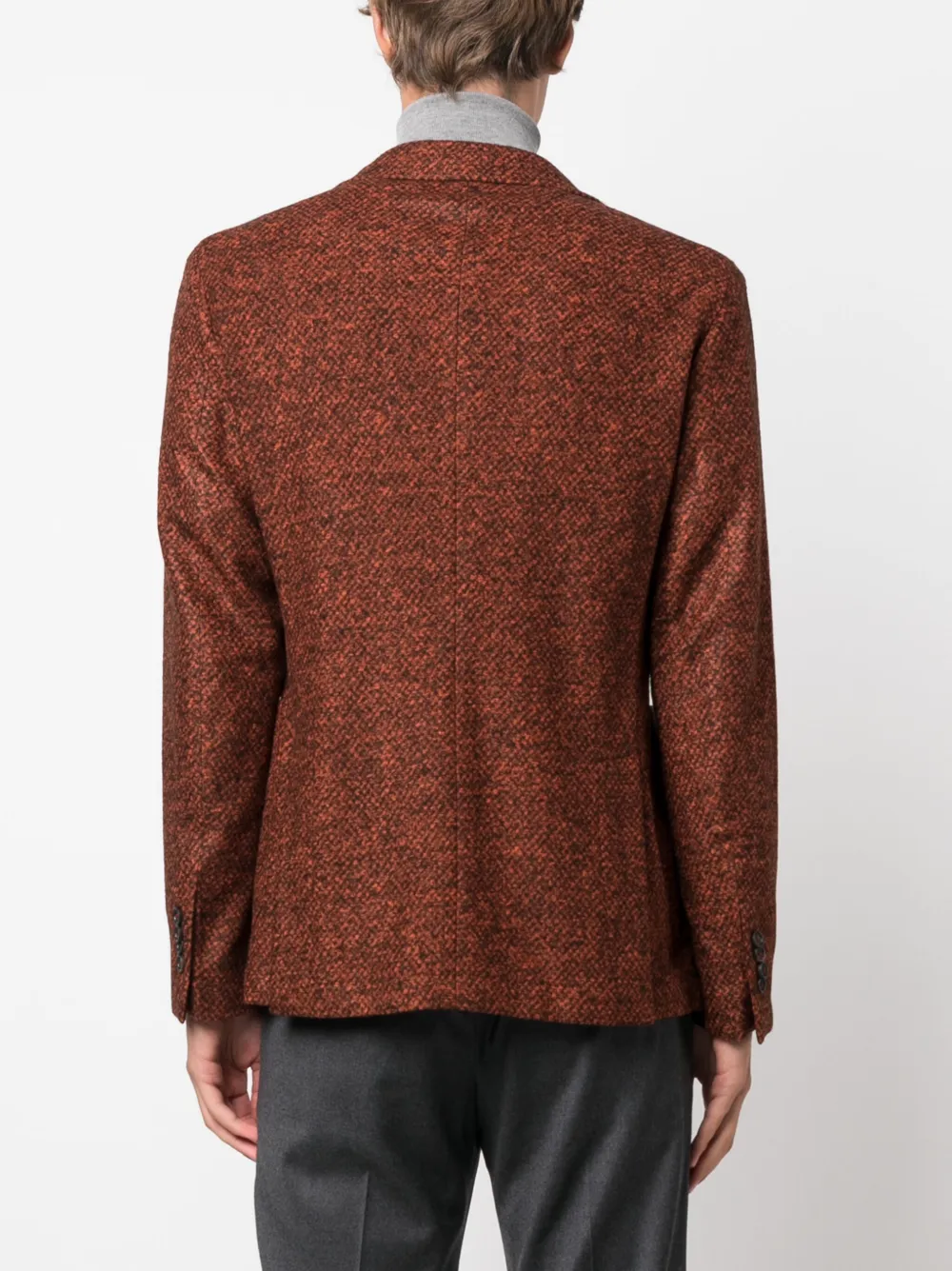 Оранжево-терракотовый, деталь из эмали, трикотажный материал, зазубренные лацканы, застежка на пуговицах спереди, два накладных кармана спереди, прорезной карман на груди, длинные рукава, рукава с манжетами на пуговицах, две боковые шлицы сзади и прямой подол.