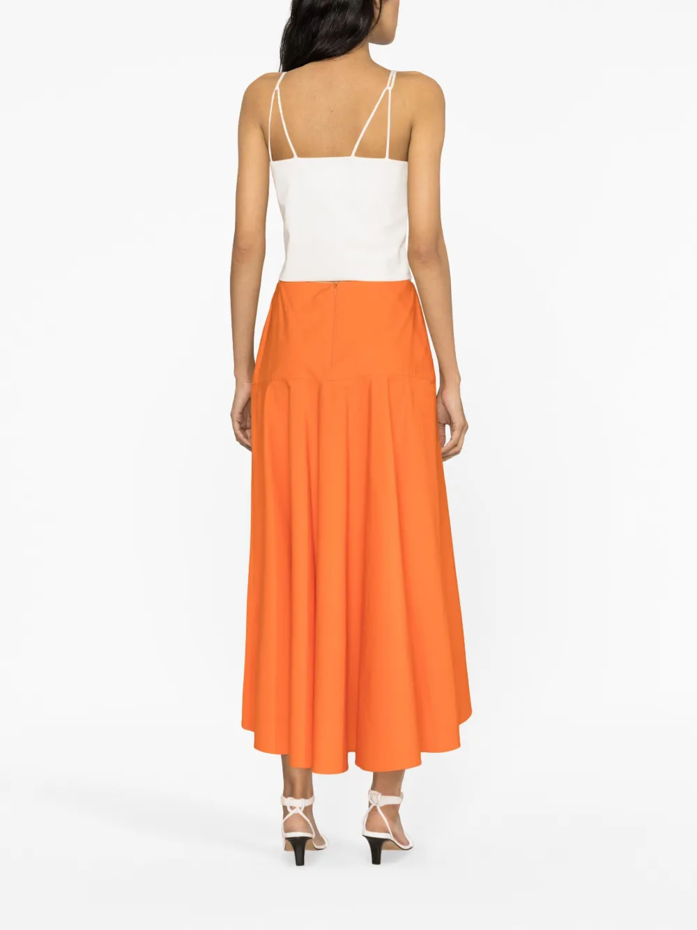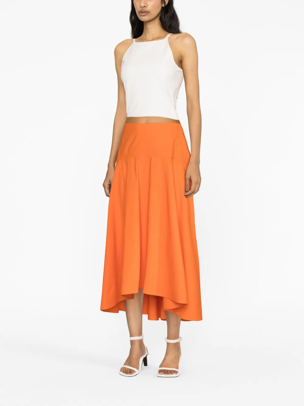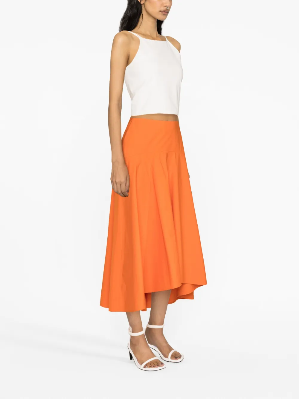 Оранжевый, хлопок, складки, неравномерный подол и длина до середины голени.