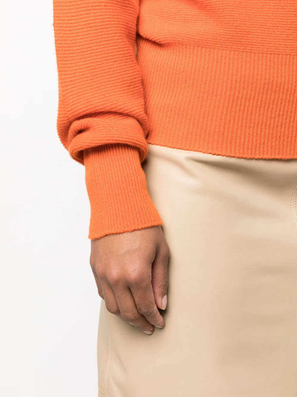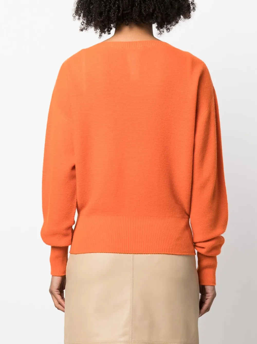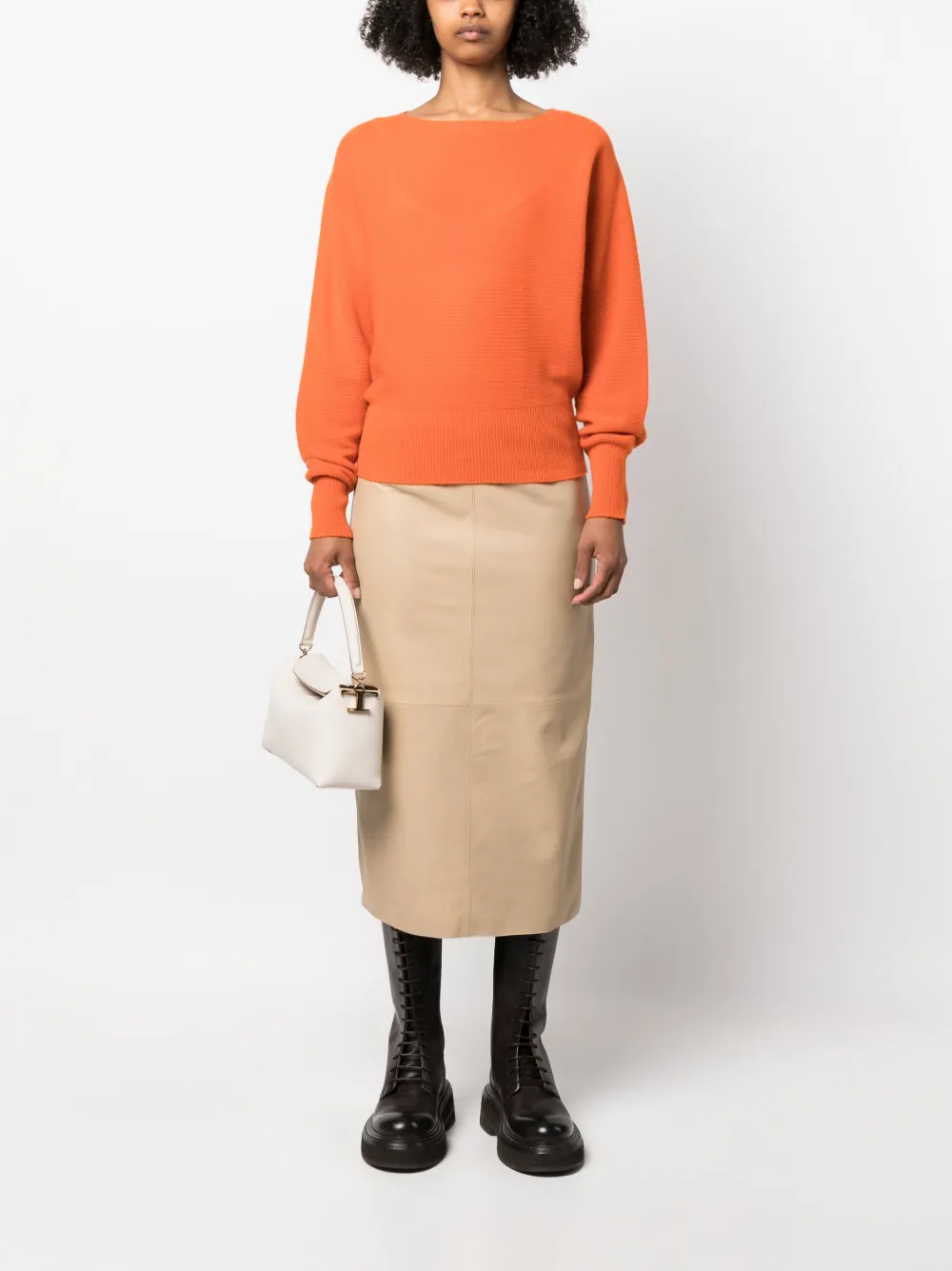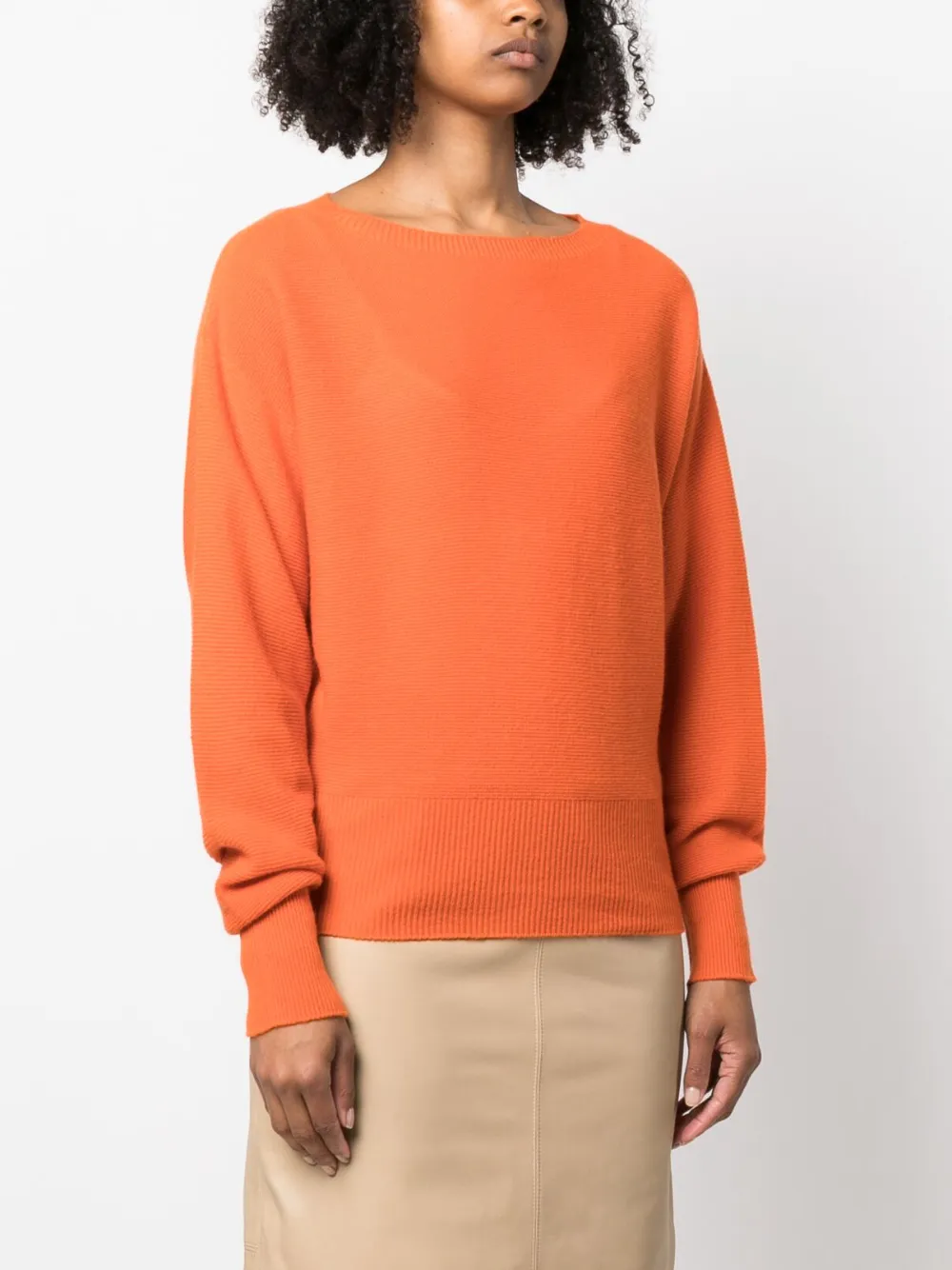 Морковный, кашемир, трикотажный материал, отделка в рубчик, вырез-лодочка, длинные рукава, приталенный силуэт и прямой подол.