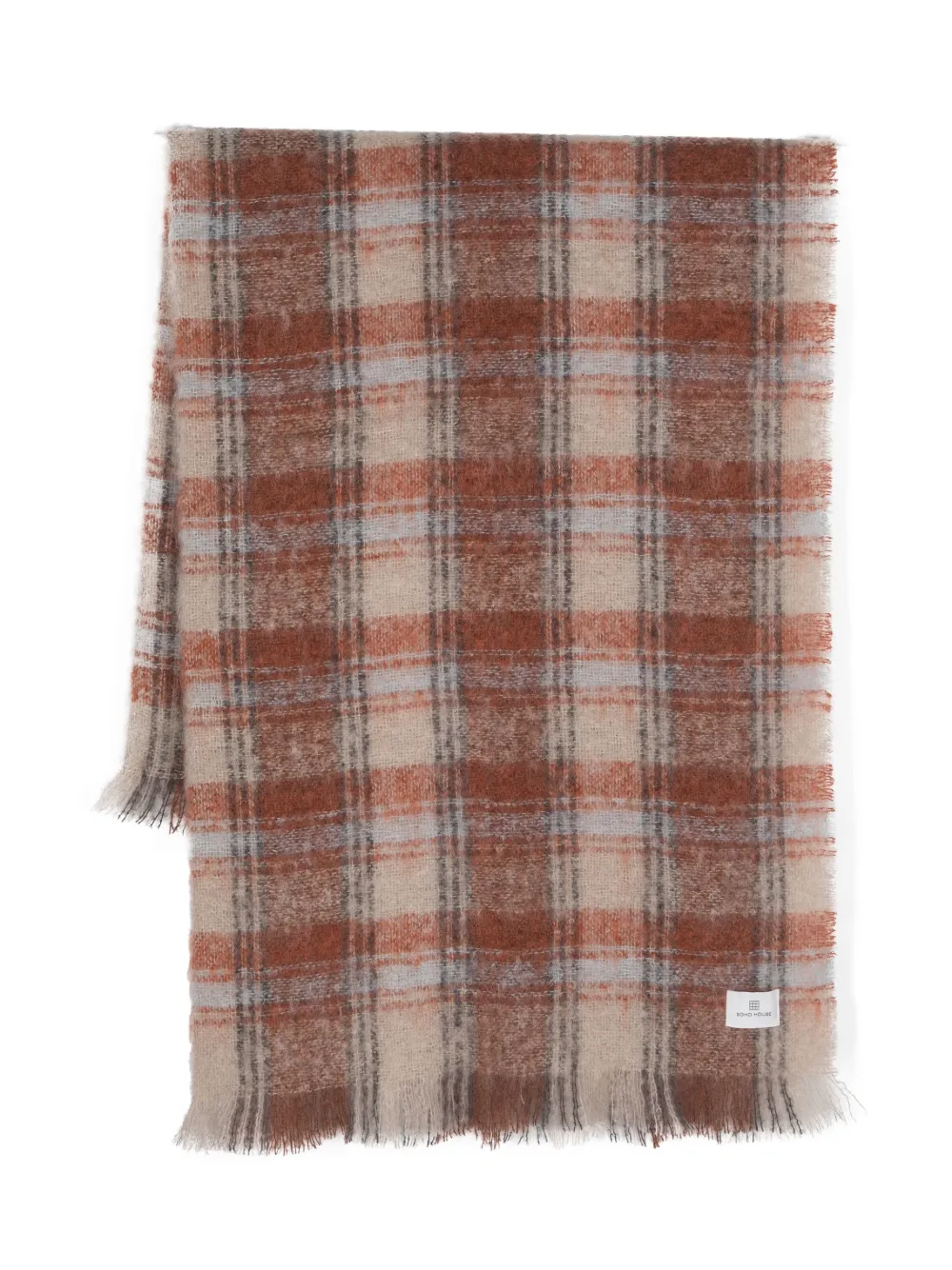 Янтарно-оранжевый, светло-бежевый, смесовый мохер, трикотажный материал, матовый эффект, необработанные края, клетчатый узор и нашивка с логотипом спереди.