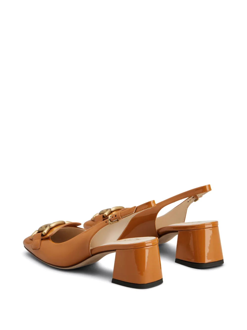 Янтарно-оранжевый, кожа, лакированная отделка, золотистая фурнитура, пряжка на носке, выгравированный логотип, квадратный носок, ремешок на пятке с пряжкой, кожаная стелька с логотипом, блочный каблук средней высоты и кожаная подошва.