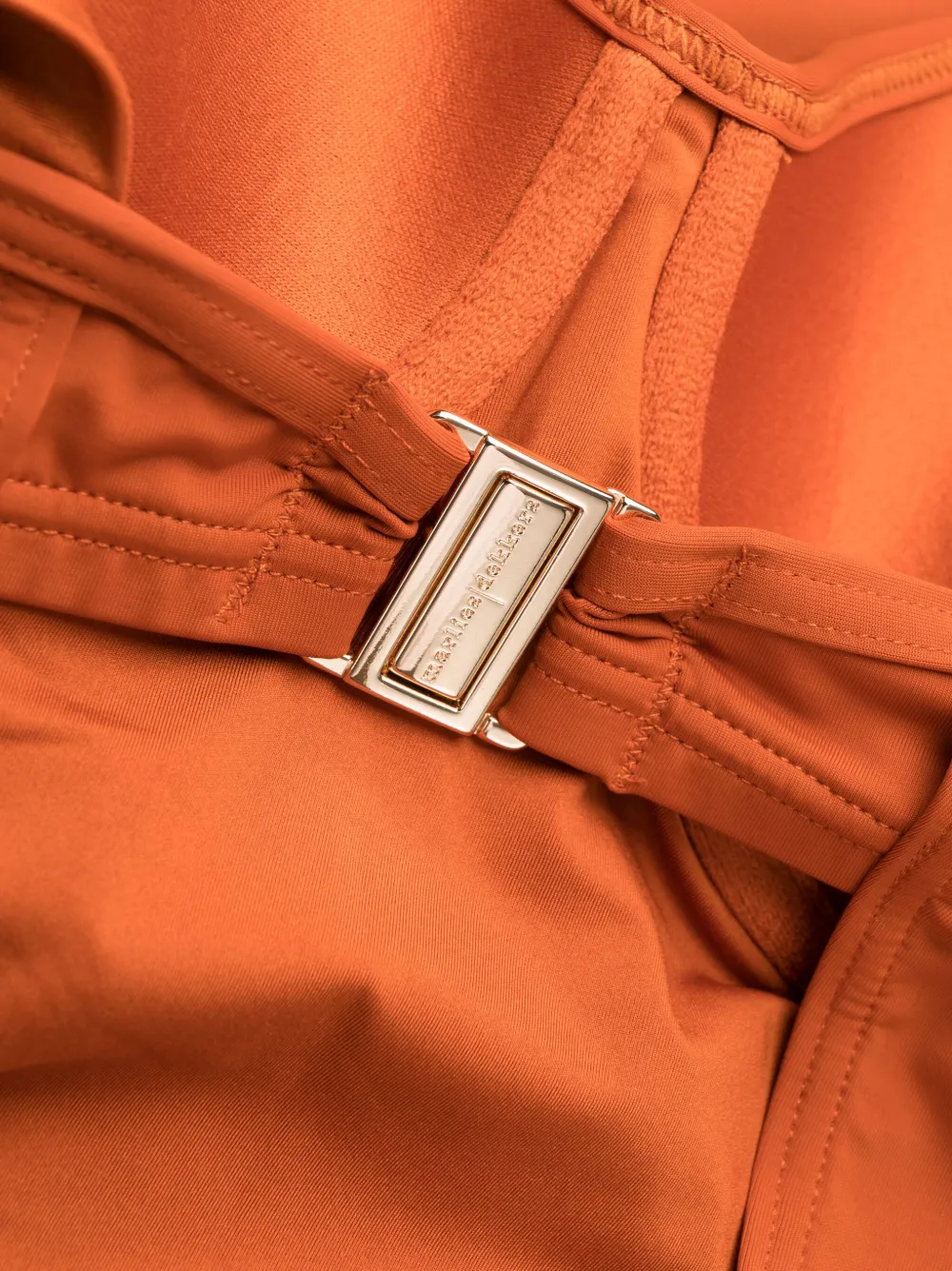Подробнее о товаре: Темно-оранжевый, смесовый переработанный нейлон, дутые вставки, вырезные детали, золотистая фурнитура с выгравированным логотипом, регулируемые лямки, застежка на крючок сзади и застежка на завязке сзади. Пожалуйста, примеряйте купальники и пляжные шорты только поверх собственного белья. Этот товар как минимум на 50% состоит из переработанных или повторно использованных материалов. Узнать больше о том, какие товары получают отметку «Ответственный выбор», можно из материала «Как мы оцениваем экологичность и этичность».