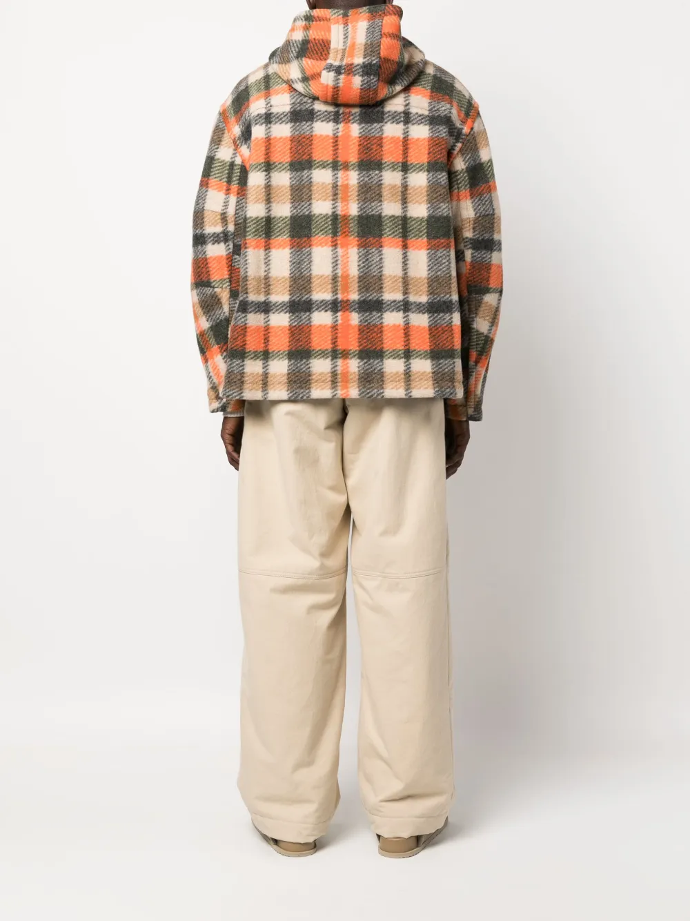 Смесовая шерсть, клетчатый узор, классический капюшон, застежка на молнии спереди, приспущенные плечи, длинные рукава, два прорезных кармана по бокам и подол с кулиской.