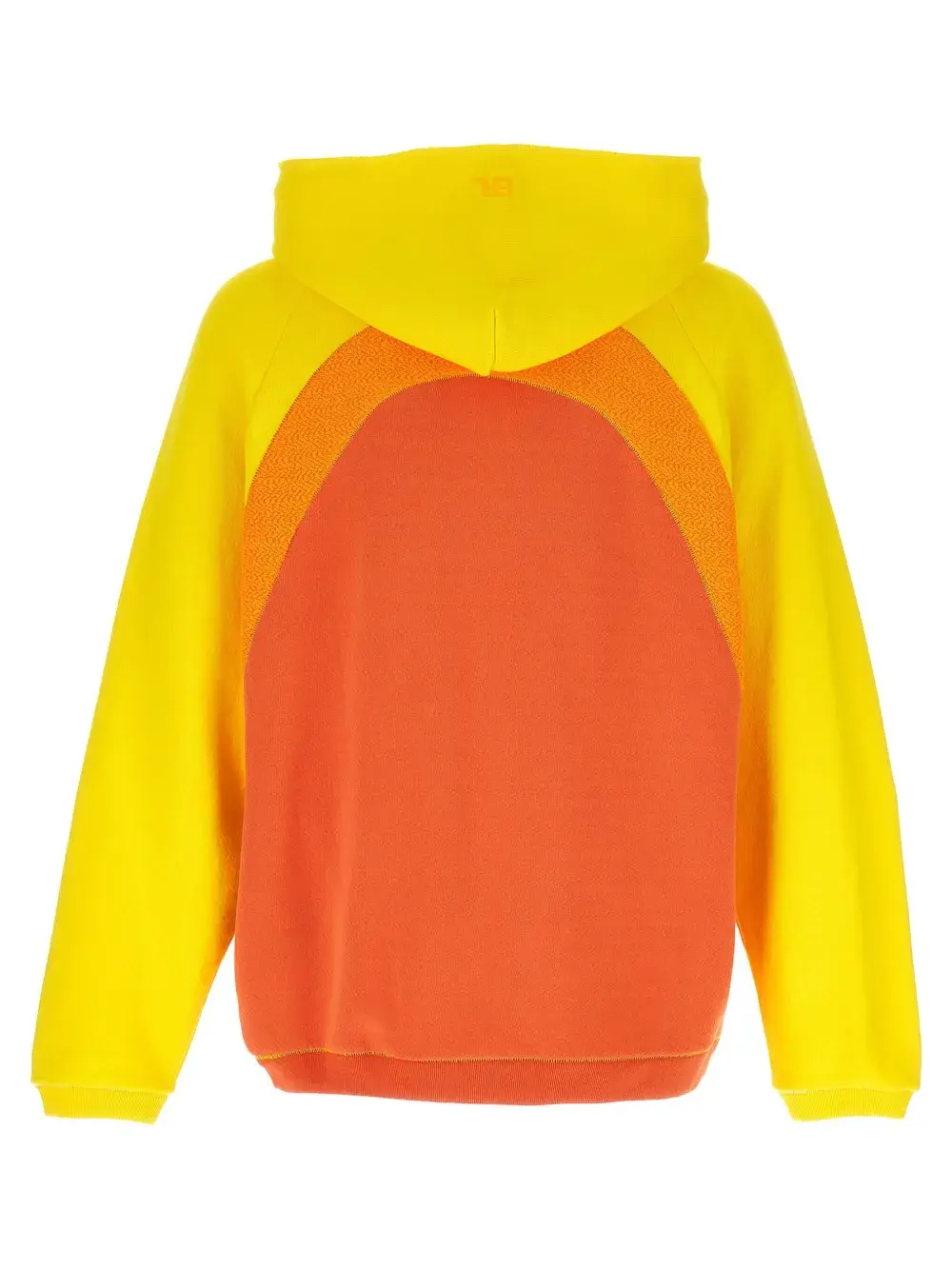 Светло-оранжевый, желтый цитрон, хлопок, вставки, материал c флисовой текстурой, градиентный эффект, затягивающийся на шнурок капюшон, длинные рукава, манжеты в рубчик и прямой подол.