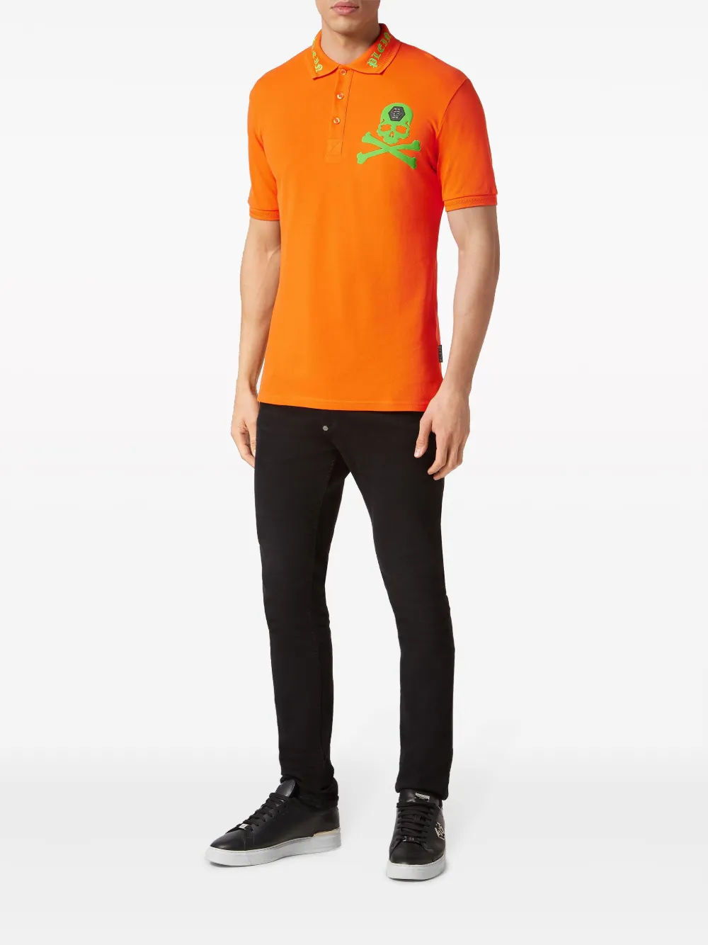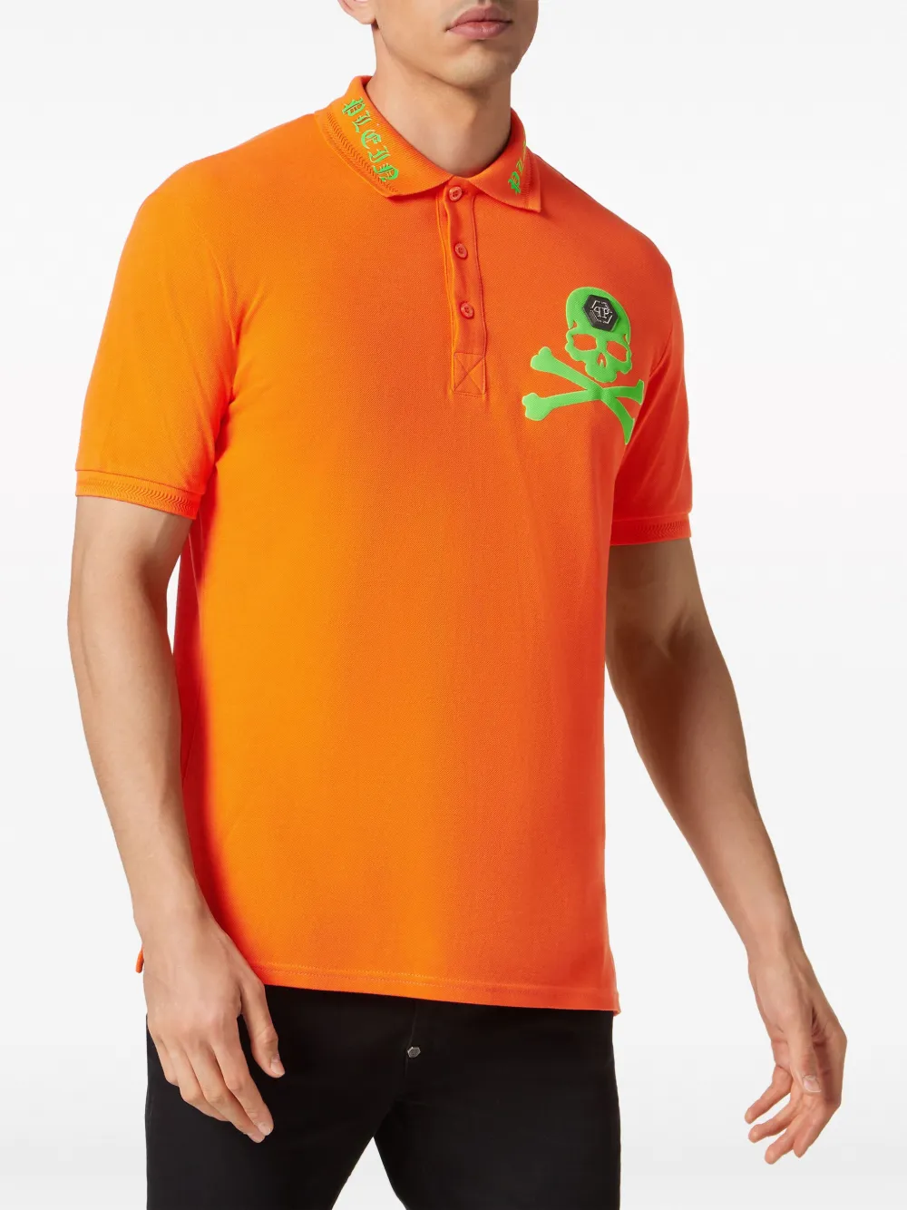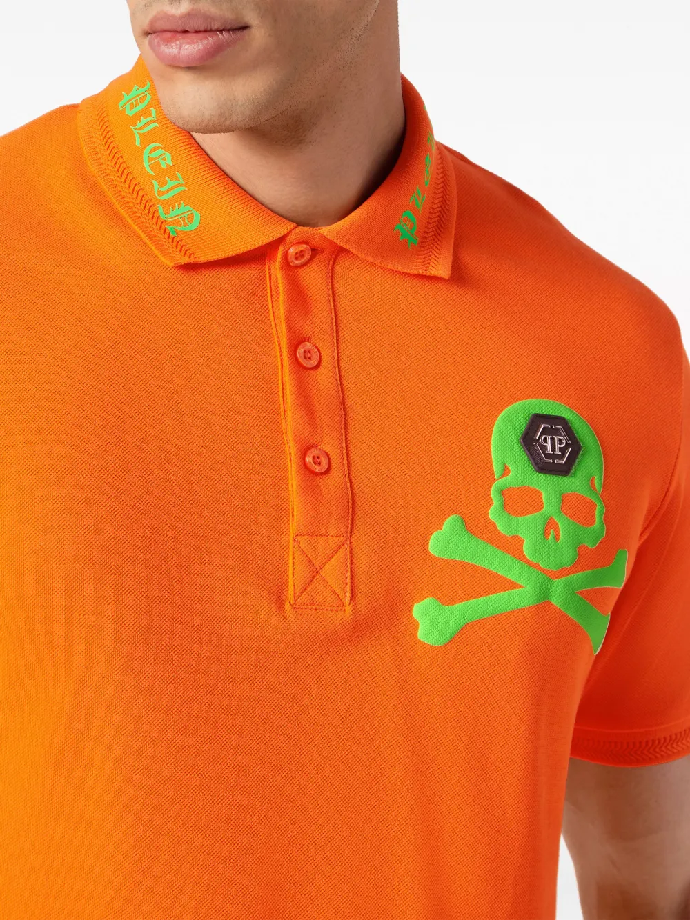 Тыквенно-оранжевый, неоново-зеленый, хлопок, принт с изображением черепа спереди, принт с логотипом на воротнике, воротник поло, планка на пуговицах спереди, короткие рукава и прямой подол.
