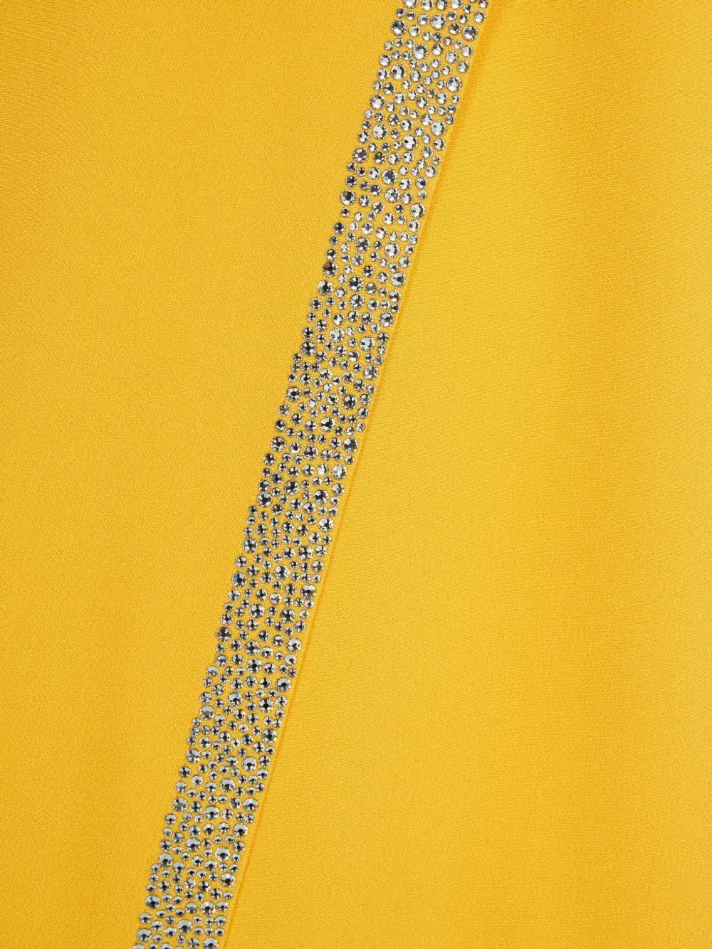 Украшение из лимонно-желтых кристаллов, вырез на одно плечо, асимметричный подол, длинный рукав, драпированная деталь