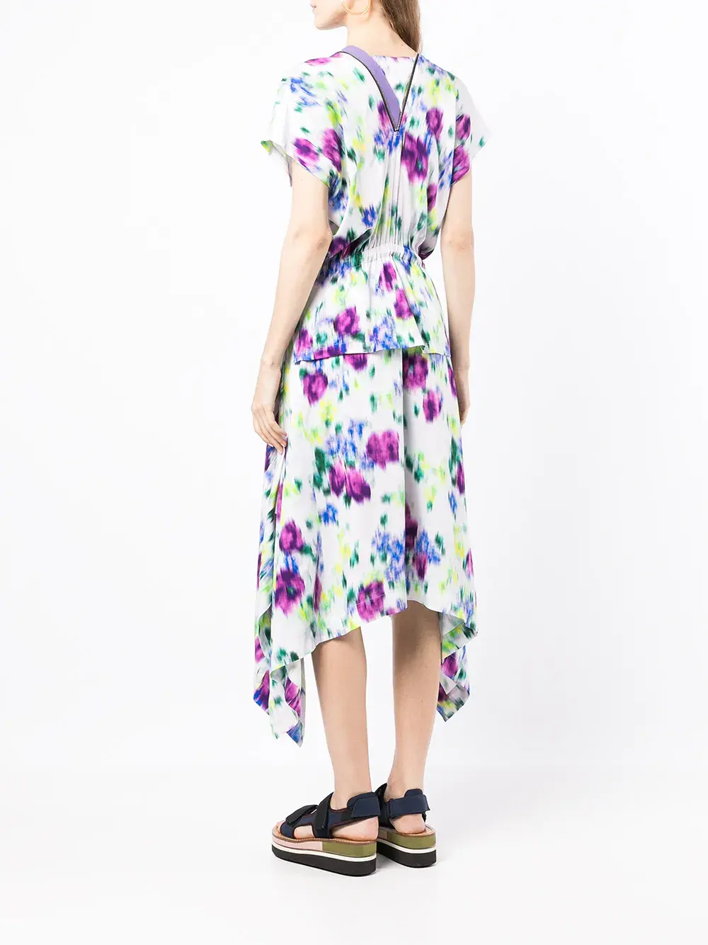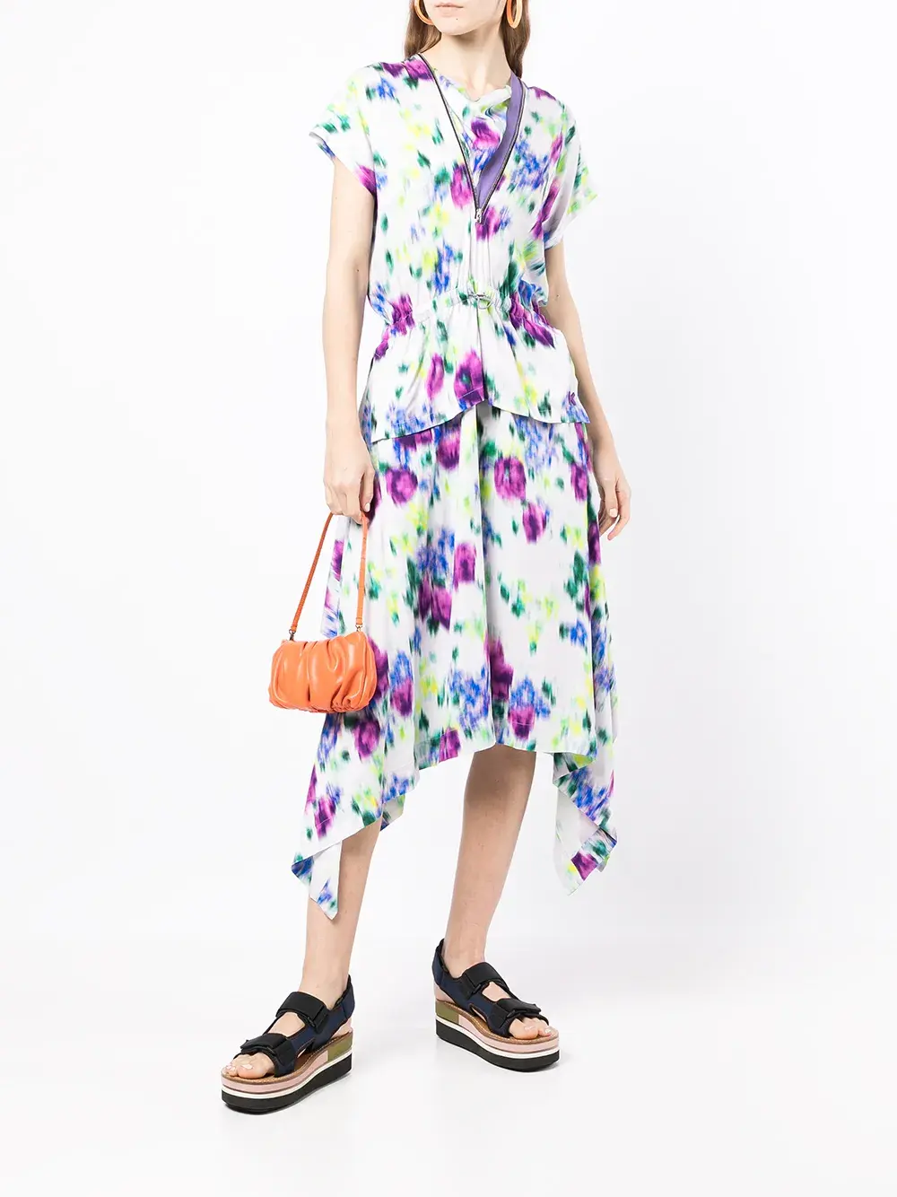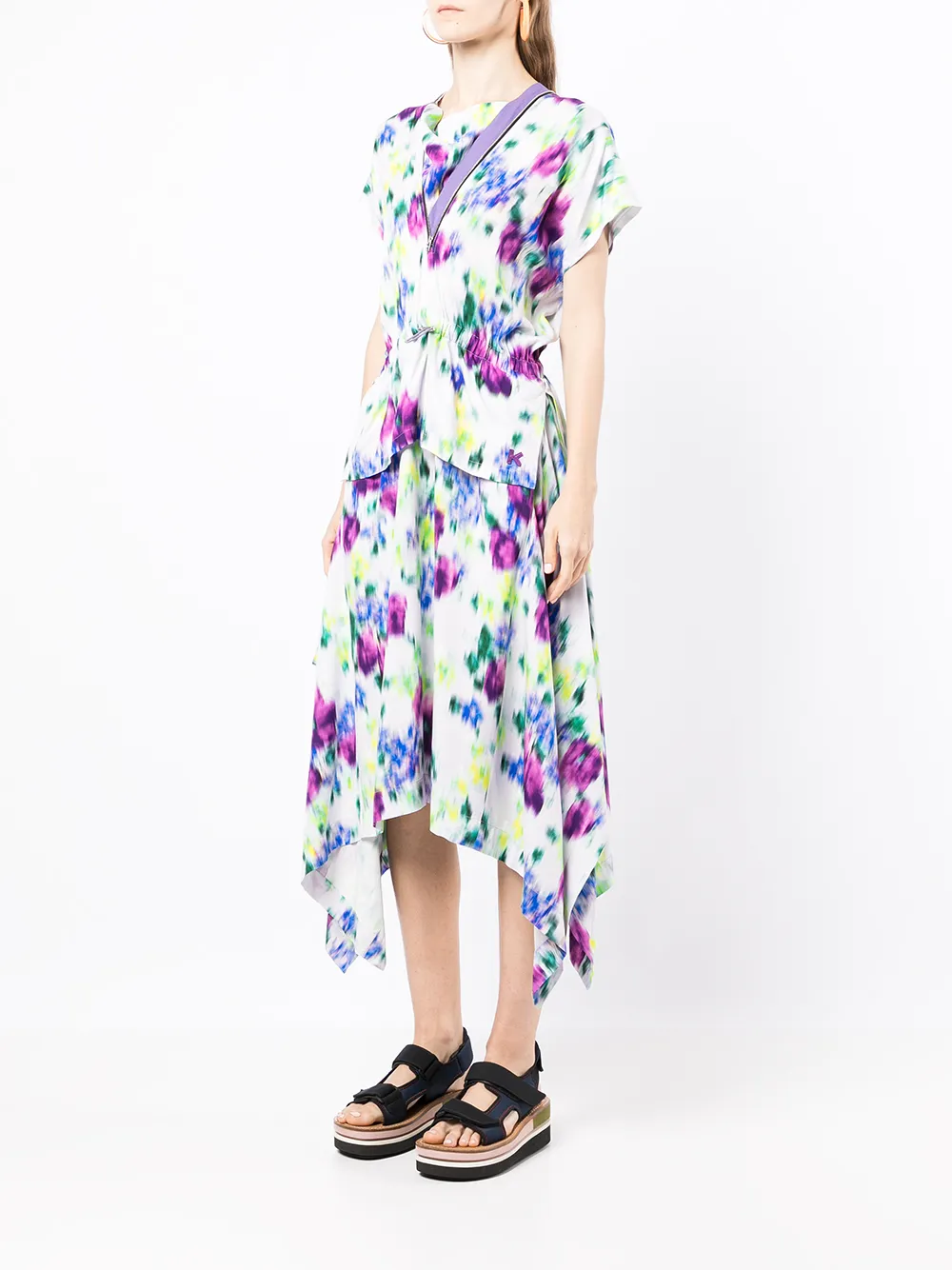 Сплошной цветочный принт, многослойный эффект, пояс на шнурке, застежка на молнии спереди, короткие рукава и асимметричный подол.