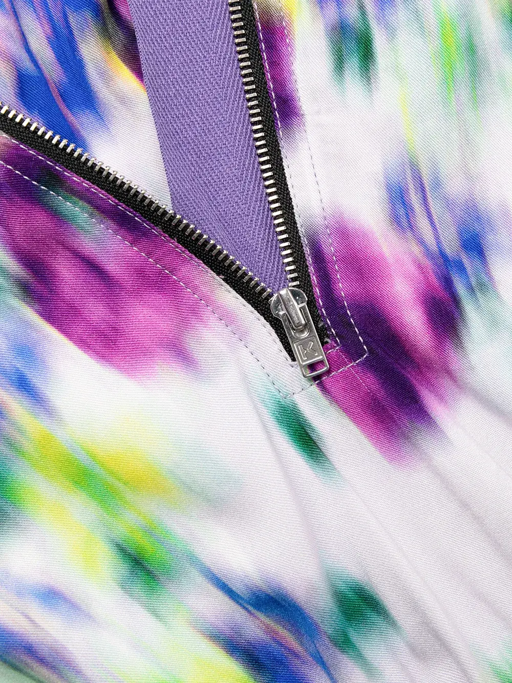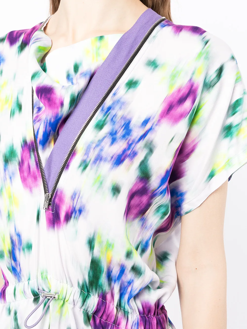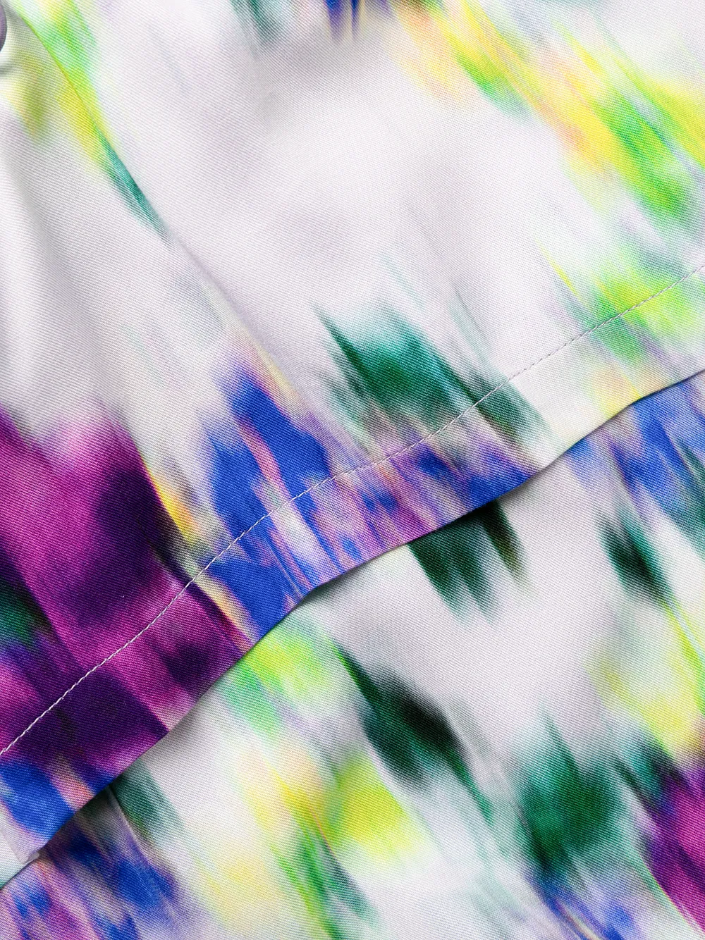 Сплошной цветочный принт, многослойный эффект, пояс на шнурке, застежка на молнии спереди, короткие рукава и асимметричный подол.