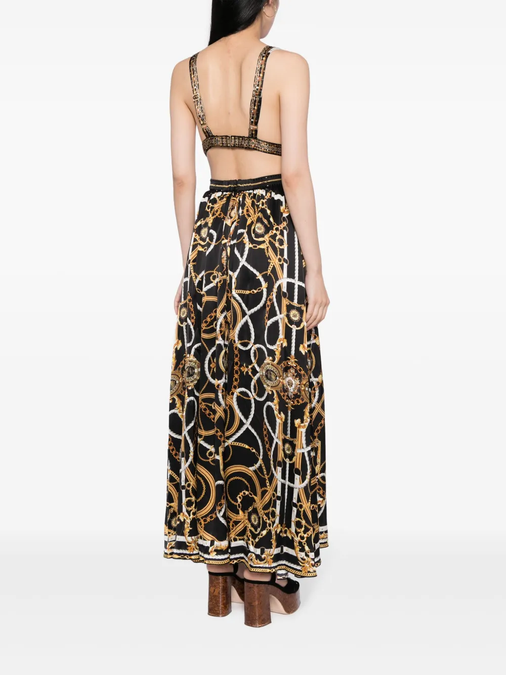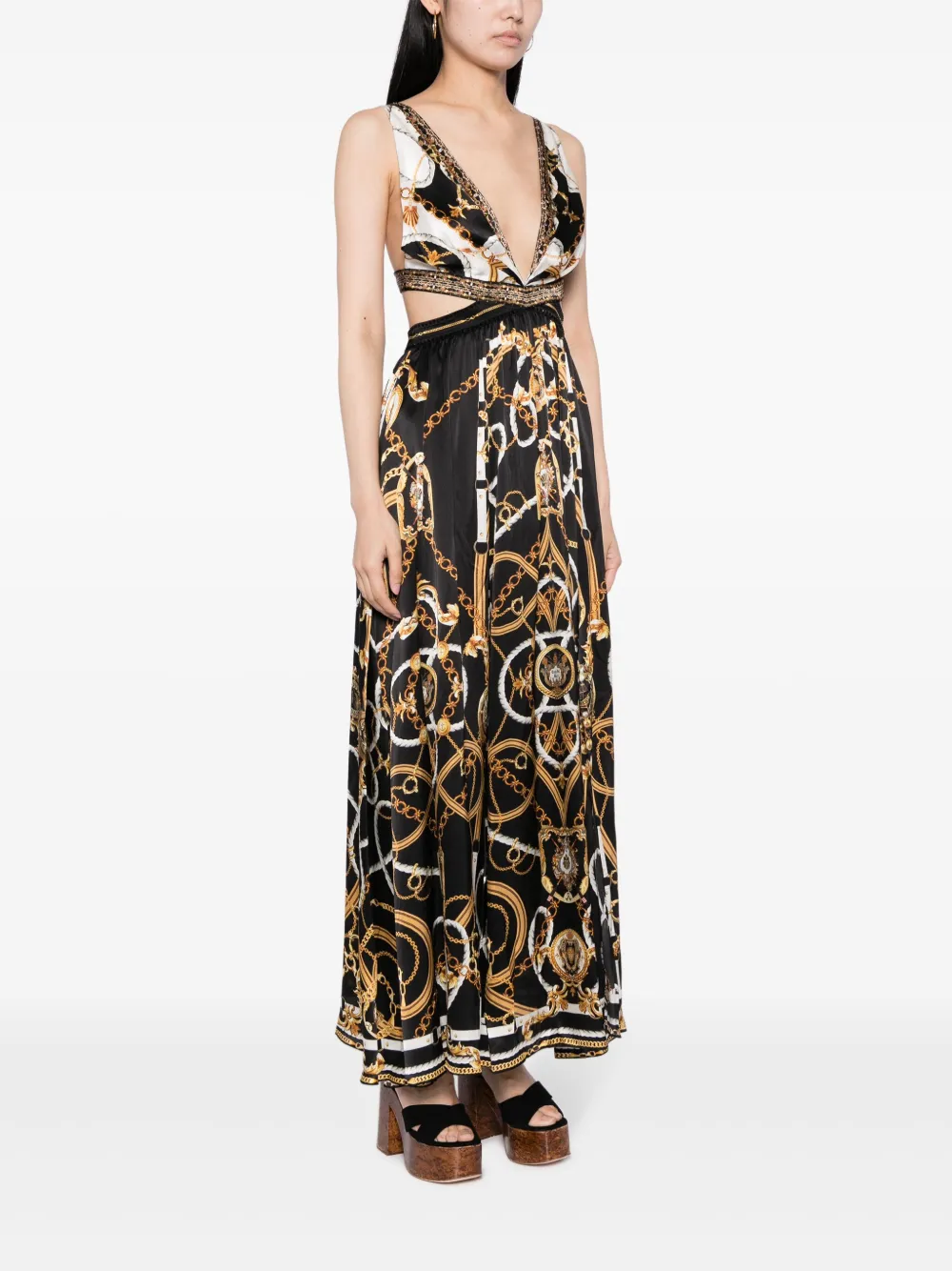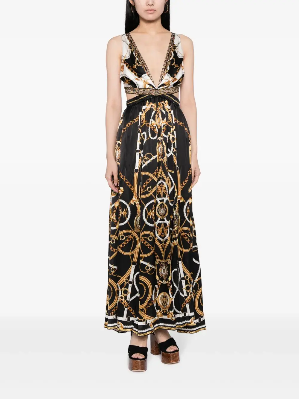 Разноцветный, шелк, узор в стиле барокко, глубокий V-образный вырез, вырезные детали, декор из кристаллов, регулируемые лямки, расклешенная юбка и длинная модель.