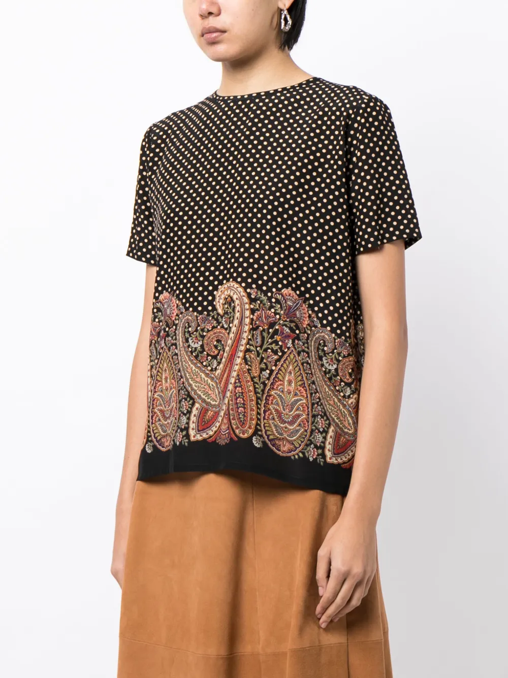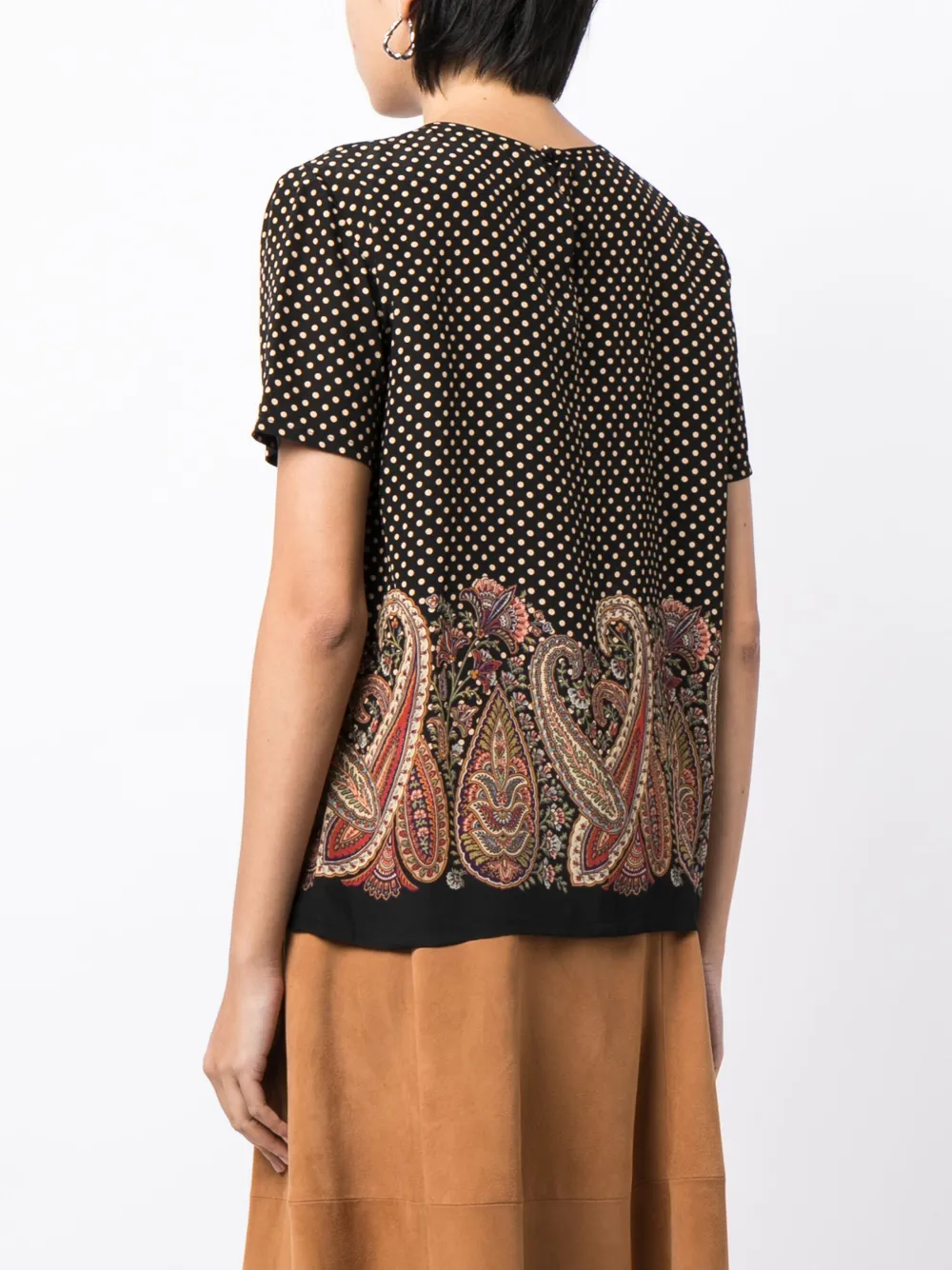 Черный/разноцветный, принт пейсли, принт в горох, круглый вырез, короткие рукава и прямой подол.