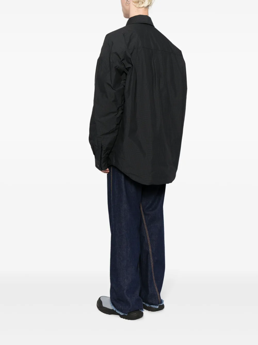 Темно-серый, смесовый хлопок, дутый материал, принт в клетку, нашивка с логотипом на рукаве, классический воротник, застежка на пуговицах спереди, длинные рукава, манжеты на пуговицах и нагрудный накладной карман.