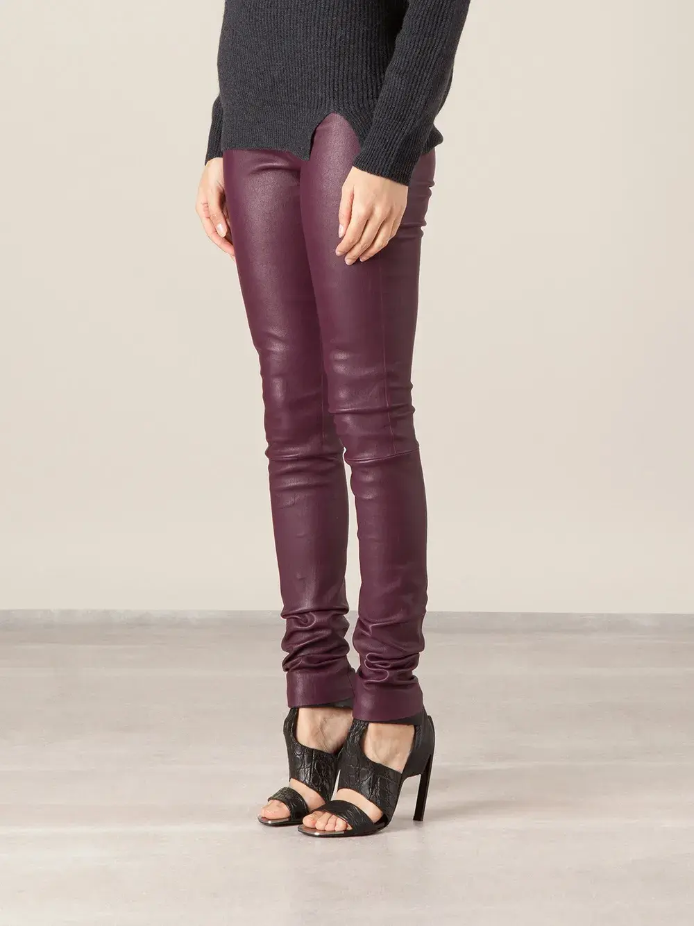 Фиолетовые узкие брюки слим из кожи ягненка от Stouls. Эластичный пояс, плотно облегающий крой скинни.