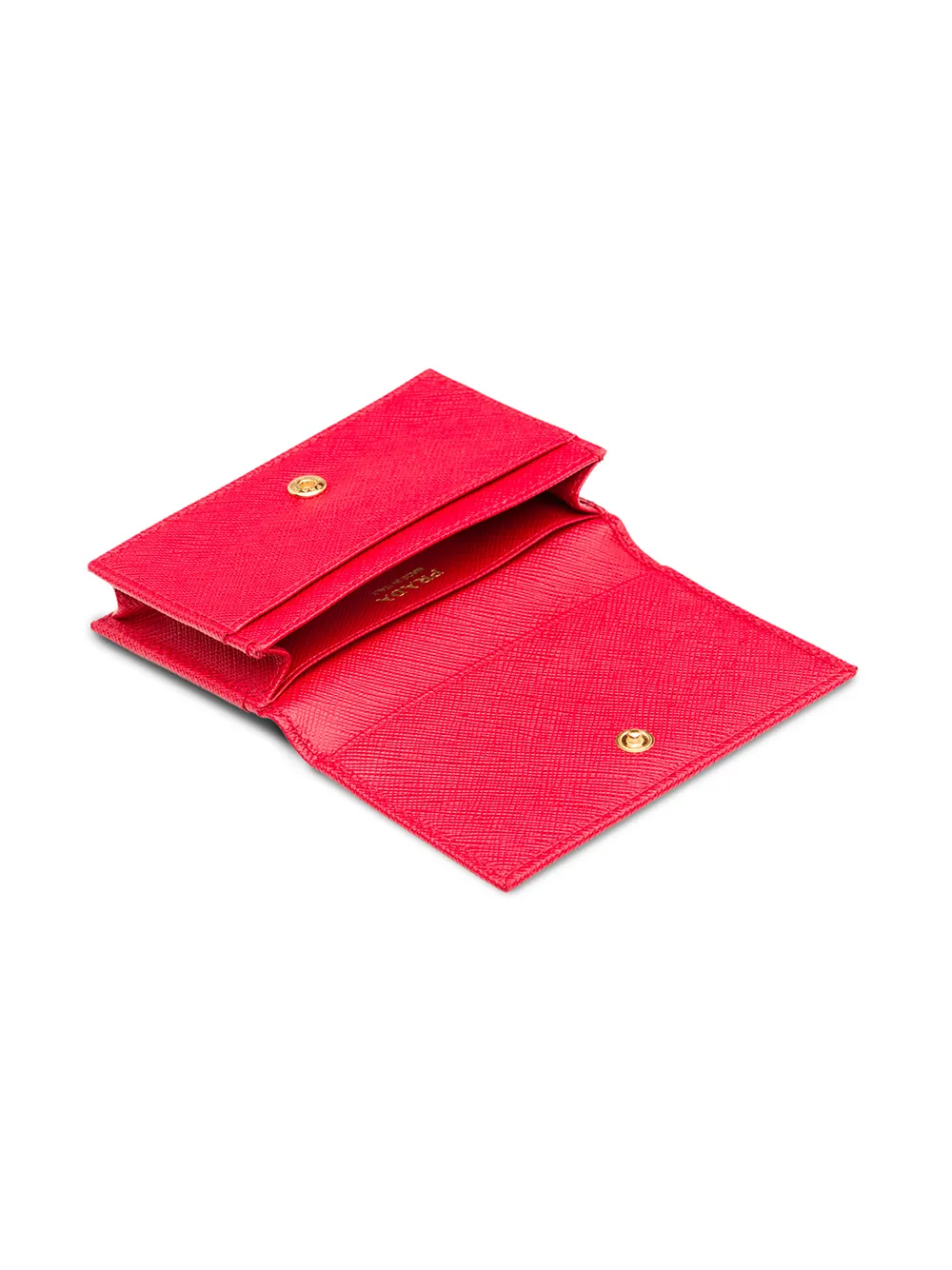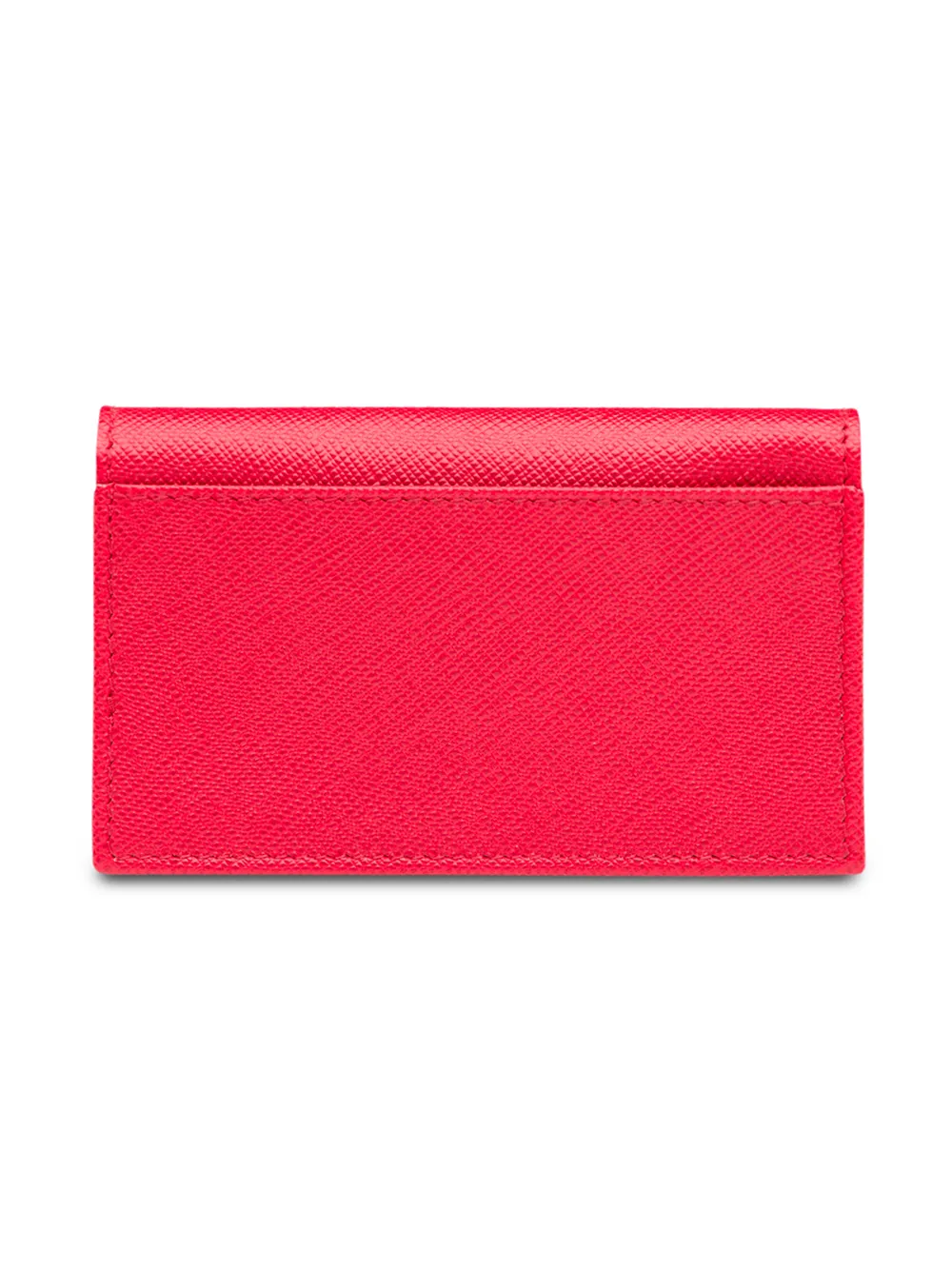 Визитница с логотипом из кожи Saffiano от Prada. Откидной верх с застежкой-защелкой, золотистая бляшка с логотипом и внутренний прорезной карман. Цвет: красный.