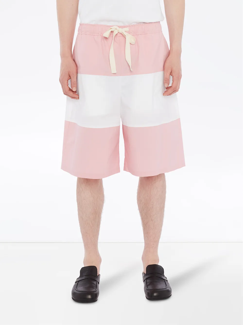 Шорты со вставками от JW Anderson. Горизонтальные панели, кулиска на талии, прорезные карманы по бокам, задние карманы, свободный крой и длина по колено.