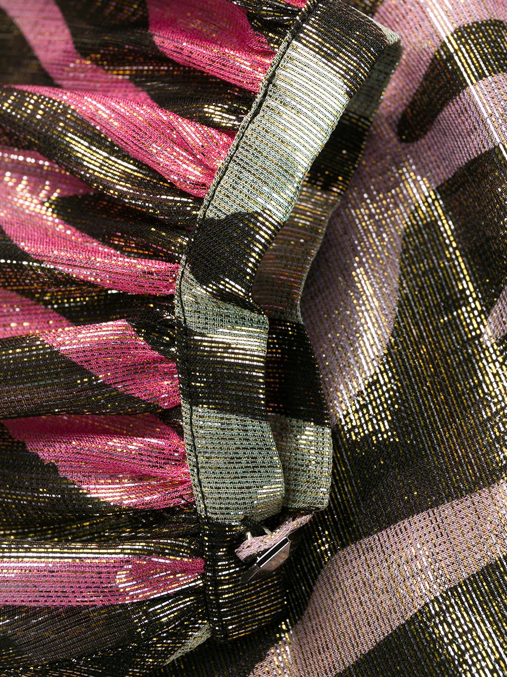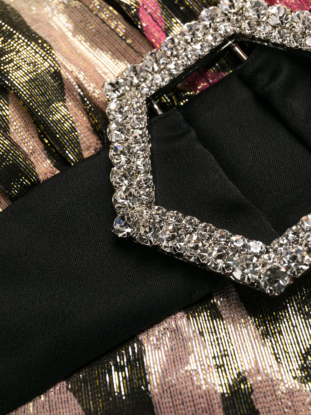 Платье мини Jungle от Philipp Plein (Филипп Плейн). Принт с животными, металлический отблеск, тонально-градиентный эффект, круглый вырез, отрезная деталь, ремень на талии, перед с запахом и задняя застежка на пуговице.
