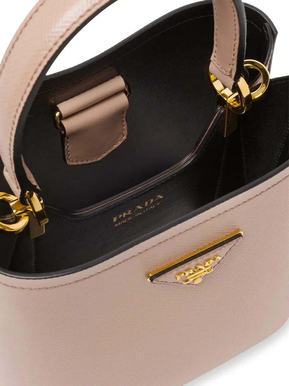 Маленькая сумка-ведро Panier от Prada (Прада). Закругленная ручка, дизайн с открытым верхом, сафьяновая кожа, пряжка с логотипом спереди, золотистая фурнитура, несколько внутренних отделений, внутренняя печать с тисненым логотипом, кожаная подкладка и кожаный ярлык.