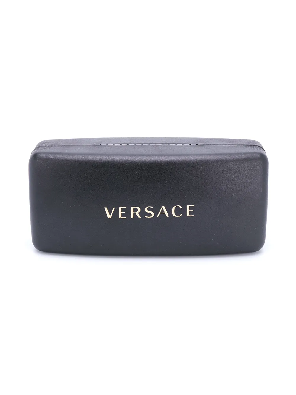 Солнцезащитные очки в овальной оправе от Versace Eyewear. Затемненные линзы, прямые дужки с остро изогнутыми концами, логотип бренда на внешней стороне дужки и золотистая фурнитура. Прилагается защитный чехол.