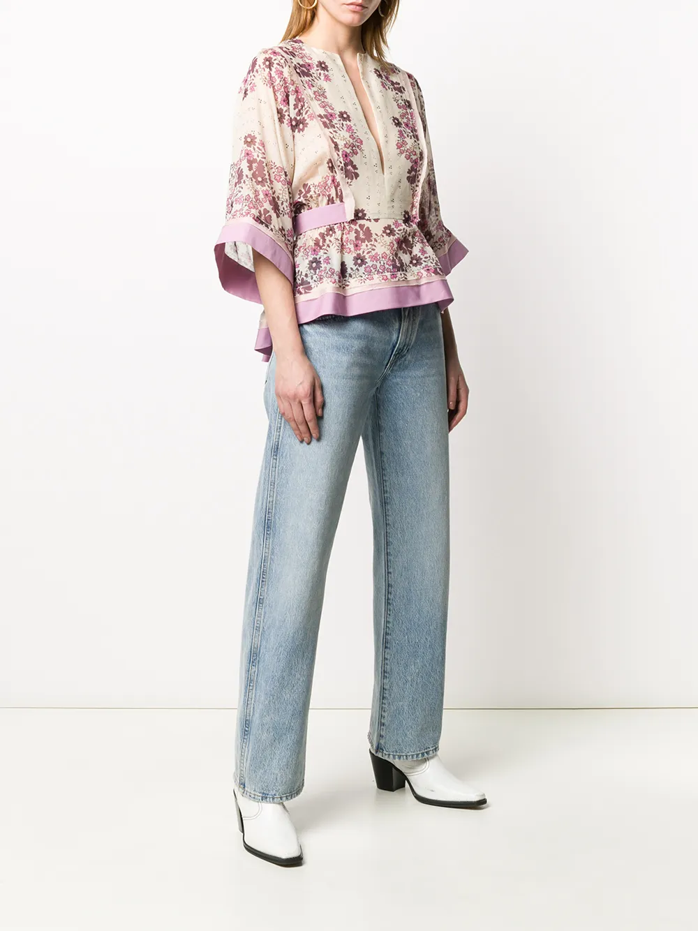 Цветочный принт всегда уместен. Хлопковая блузка с цветочным принтом цвета экрю и фуксии от Dsquared2 (Дискуэд) - настоящее воплощение женственности. Имеет круглый вырез, разрез на груди, рукава три четверти и талию на завязке.