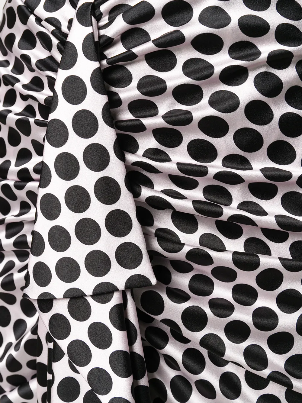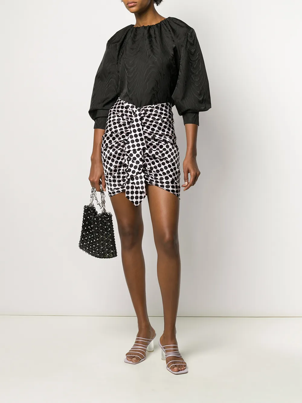 Юбка мини со сборками от Alexandre Vauthier. Узор в горох, потайная застежка на молнии и короткая длина.
