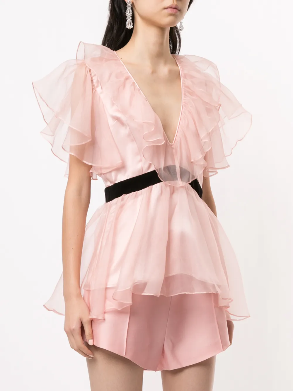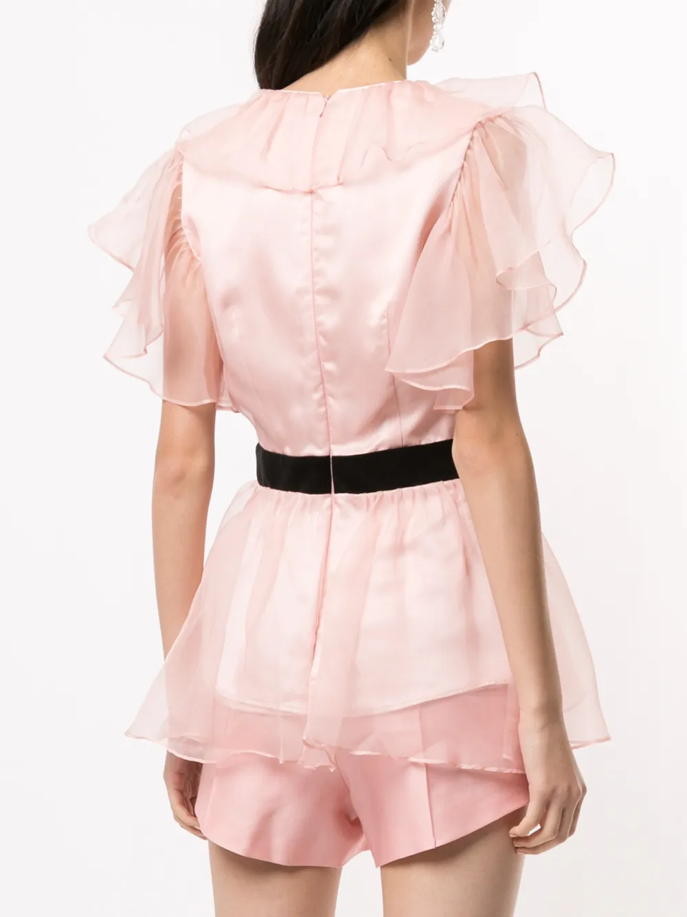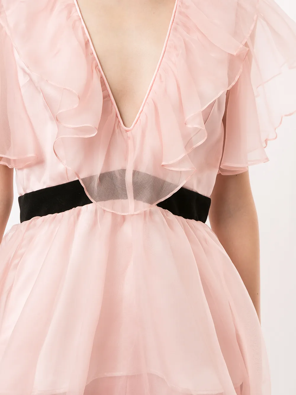 Верхний слой из тюля, V-образный вырез, баска и потайная застежка на молнии сзади. Цвет: розовый.