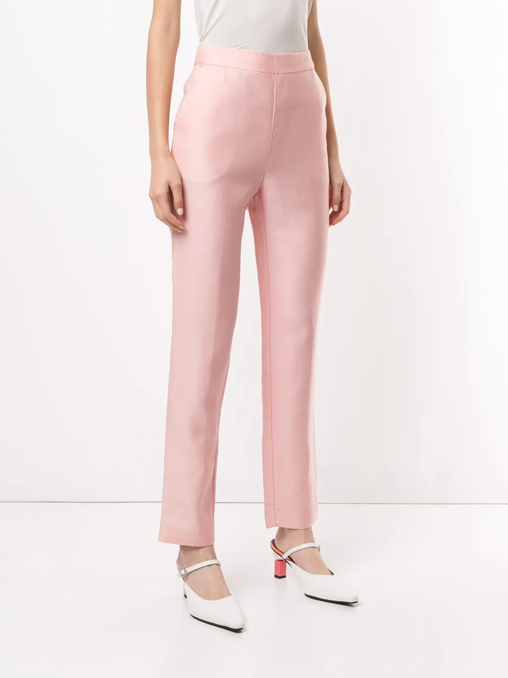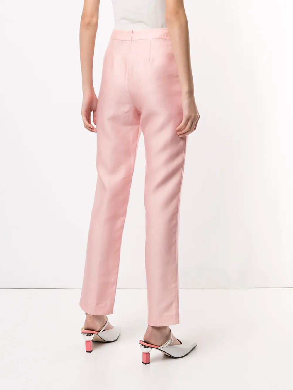 Завышенная талия, стрелки, прорезные карманы по бокам, облегающий крой и застежка на молнии сзади. Цвет: розовый.