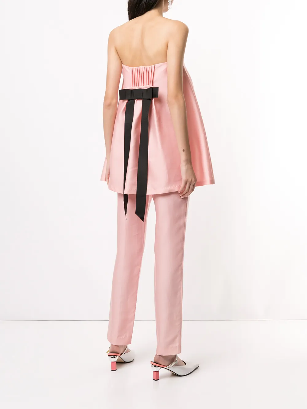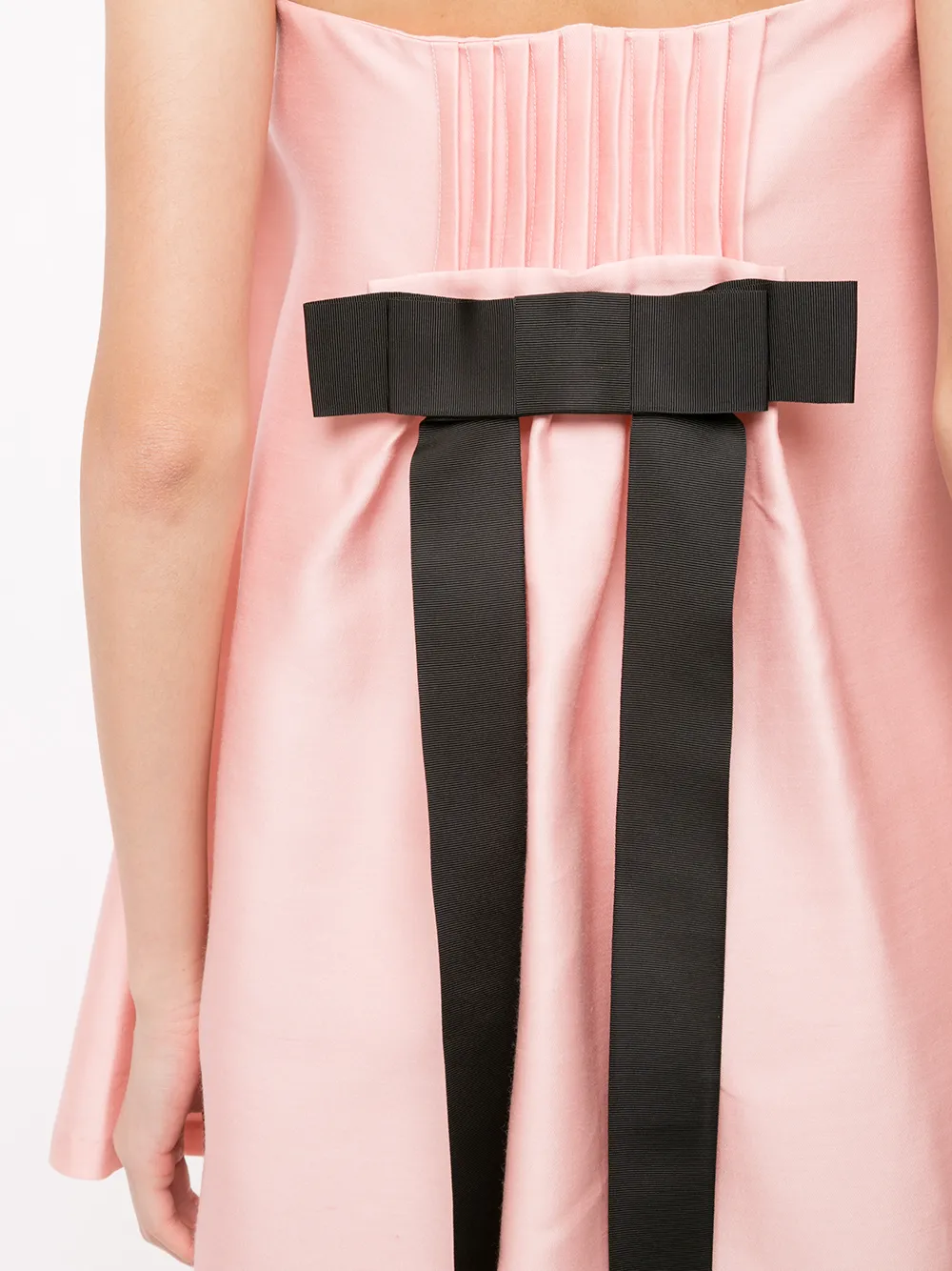 Открытые плечи, плиссированная юбка, завязка на бант сзади и расклешенный подол.