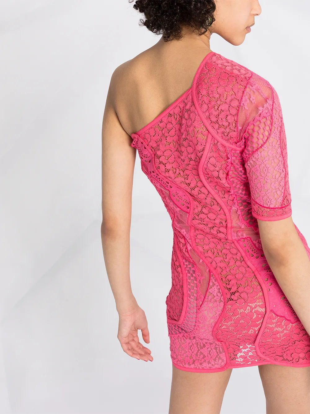Вставки из цветочного кружева, полупрозрачный дизайн, модель на одном плече, короткие рукава, потайная застежка на молнии сбоку и длина до бедер. Цвет: розовый. POSITIVELY CONSCIOUS: Мы объединились с агентством Good On You, которое составляет рейтинг ответственных марок. Этот бренд получил отметку «Ответственный выбор», так как отвечает ключевым стандартам агентства.