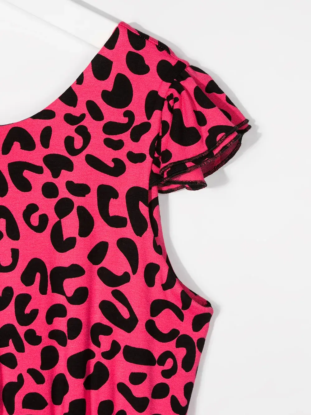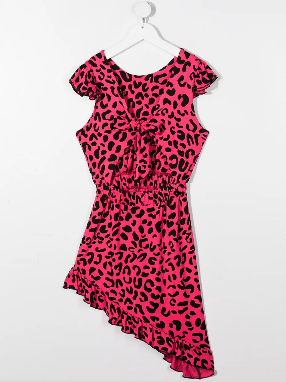 Эластичная модель, леопардовый принт, вставки с оборками, неравномерный подол, круглый вырез и без рукавов.