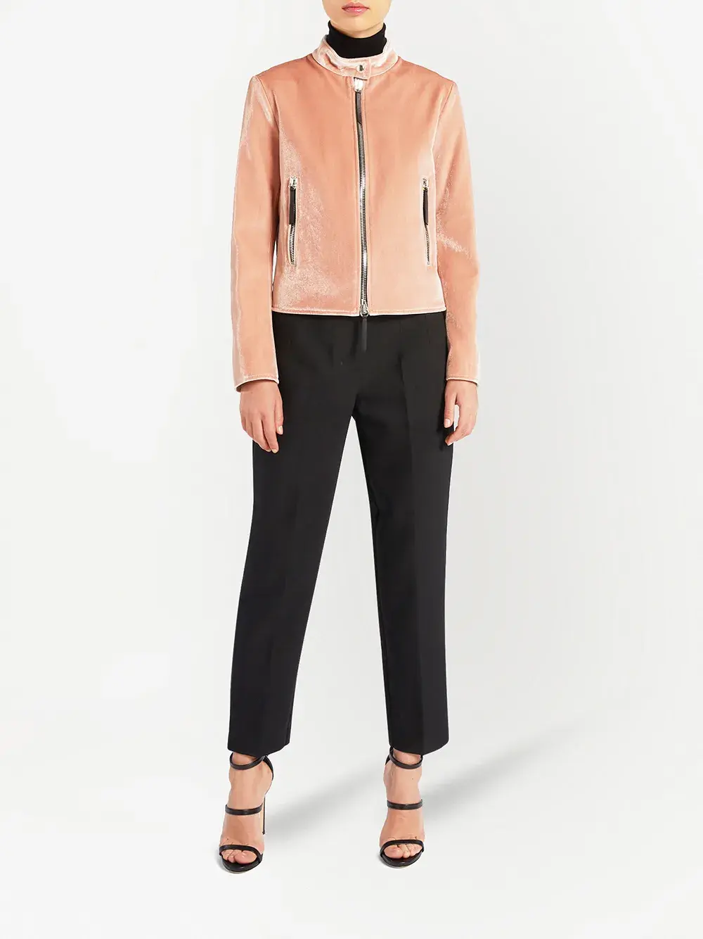 Высокий воротник, застежка на молнии спереди, передние карманы на молнии, длинные рукава и прямой подол.