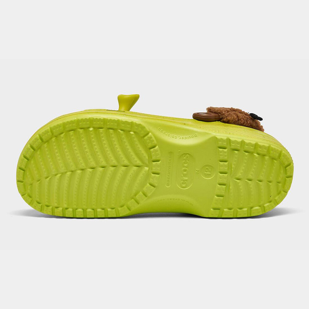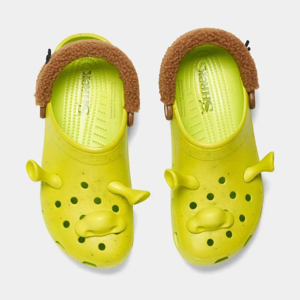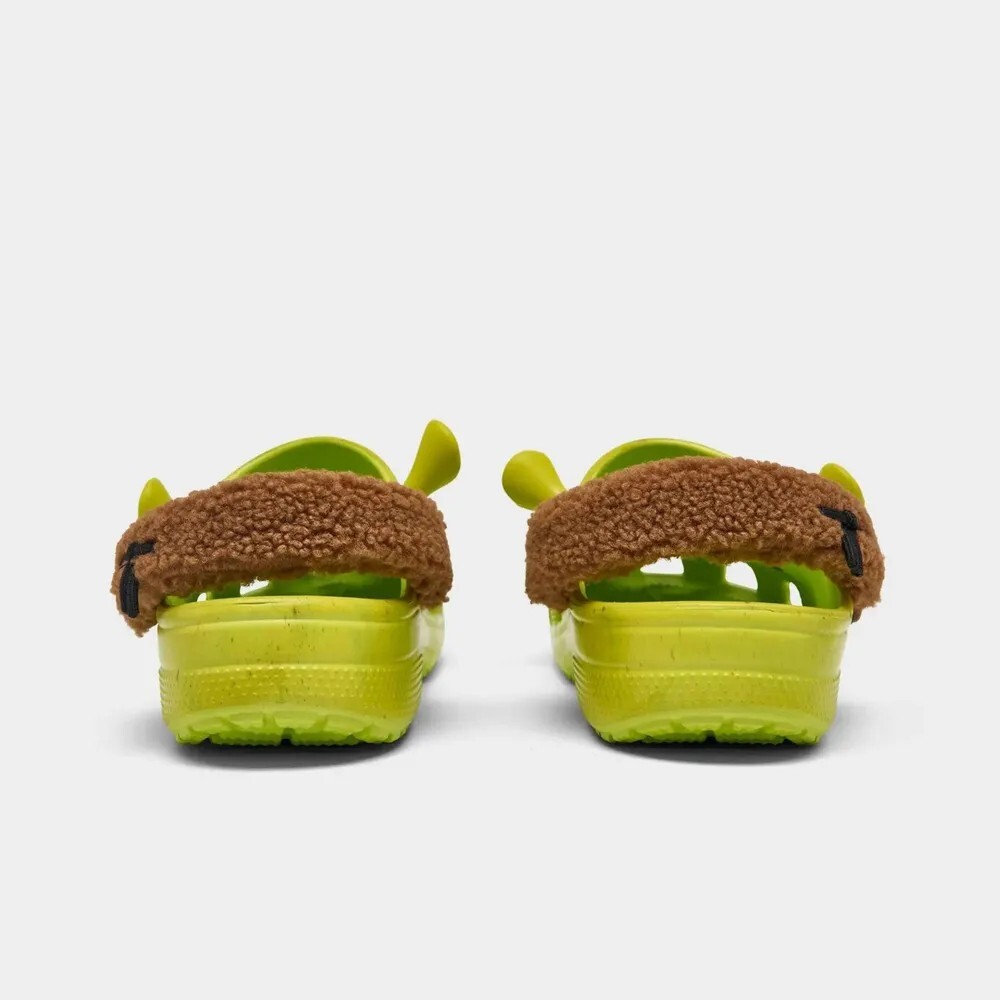 Модель Shrek x Crocs имеет яркую зеленую основу из вспененного материала EVA с веснушками, что отражает кожу культового персонажа Dreamworks. Примечательные детали - фирменные уши и нос Шрека на передней части сабо - придают им характер. Коричневая флисовая подкладка сзади добавляет глубины, а официальный логотип Шрека на кнопке голенища и стельке подтверждает подлинность сотрудничества.