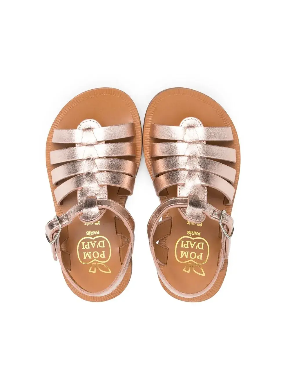 Покрытие с эффектом металлик, плетеные лямки, открытый носок, ремешок на щиколотке с пряжкой, кожаная стелька с логотипом и резиновая подошва.